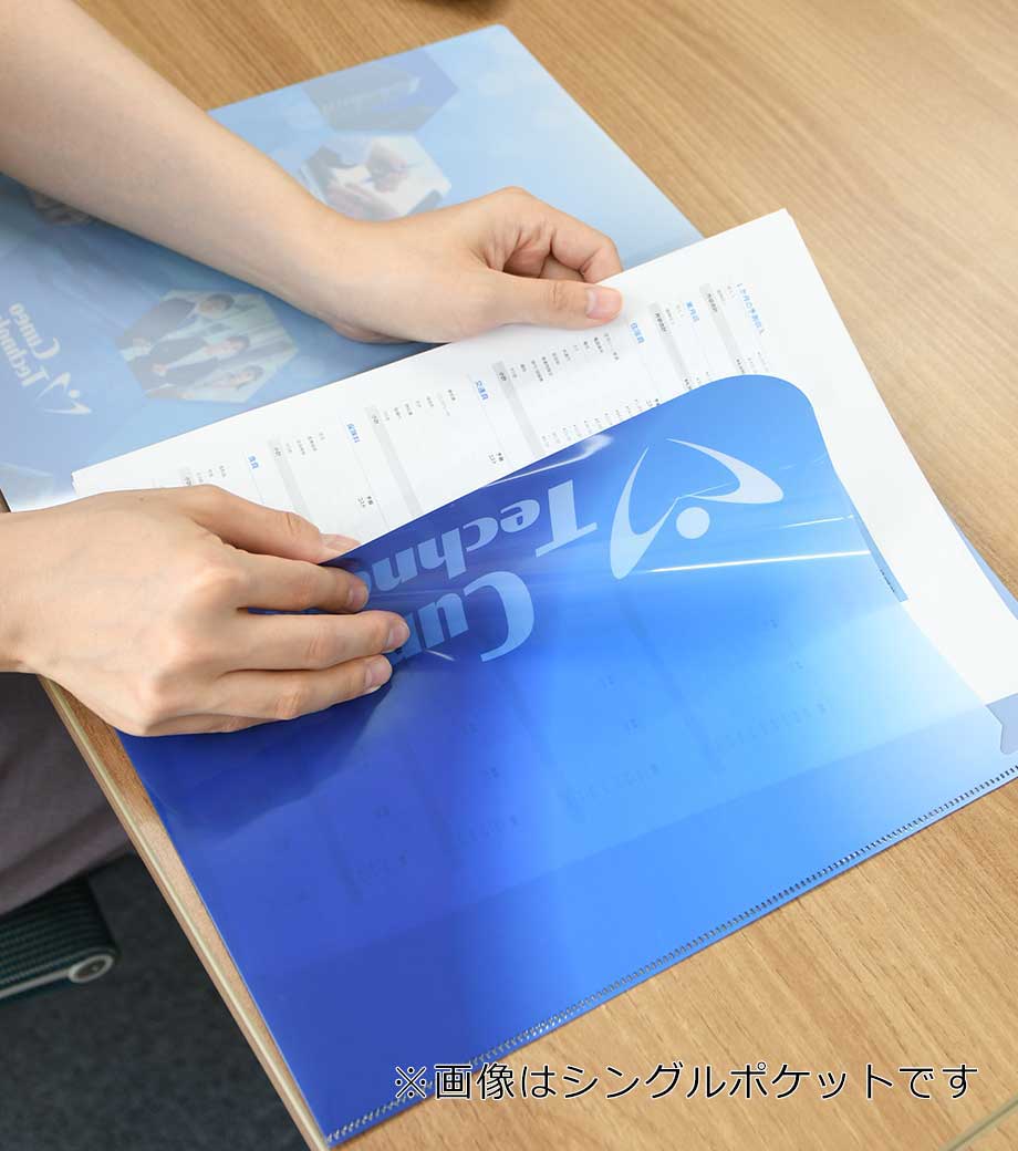 1色印刷が可能。学校関係からオフィスの書類整理だけではなく、家での取説収納にも幅広く使えるファイル。企業やショップのオリジナルグッズに人気のノベルティです。