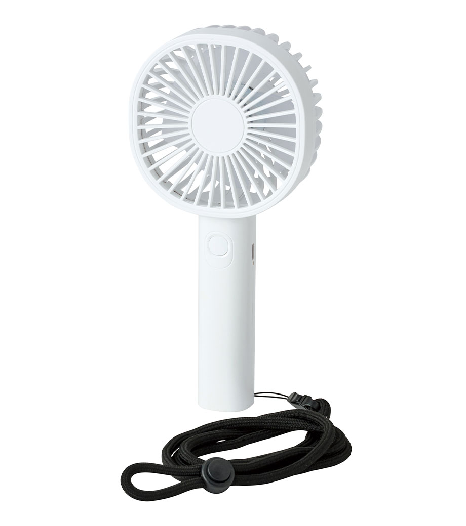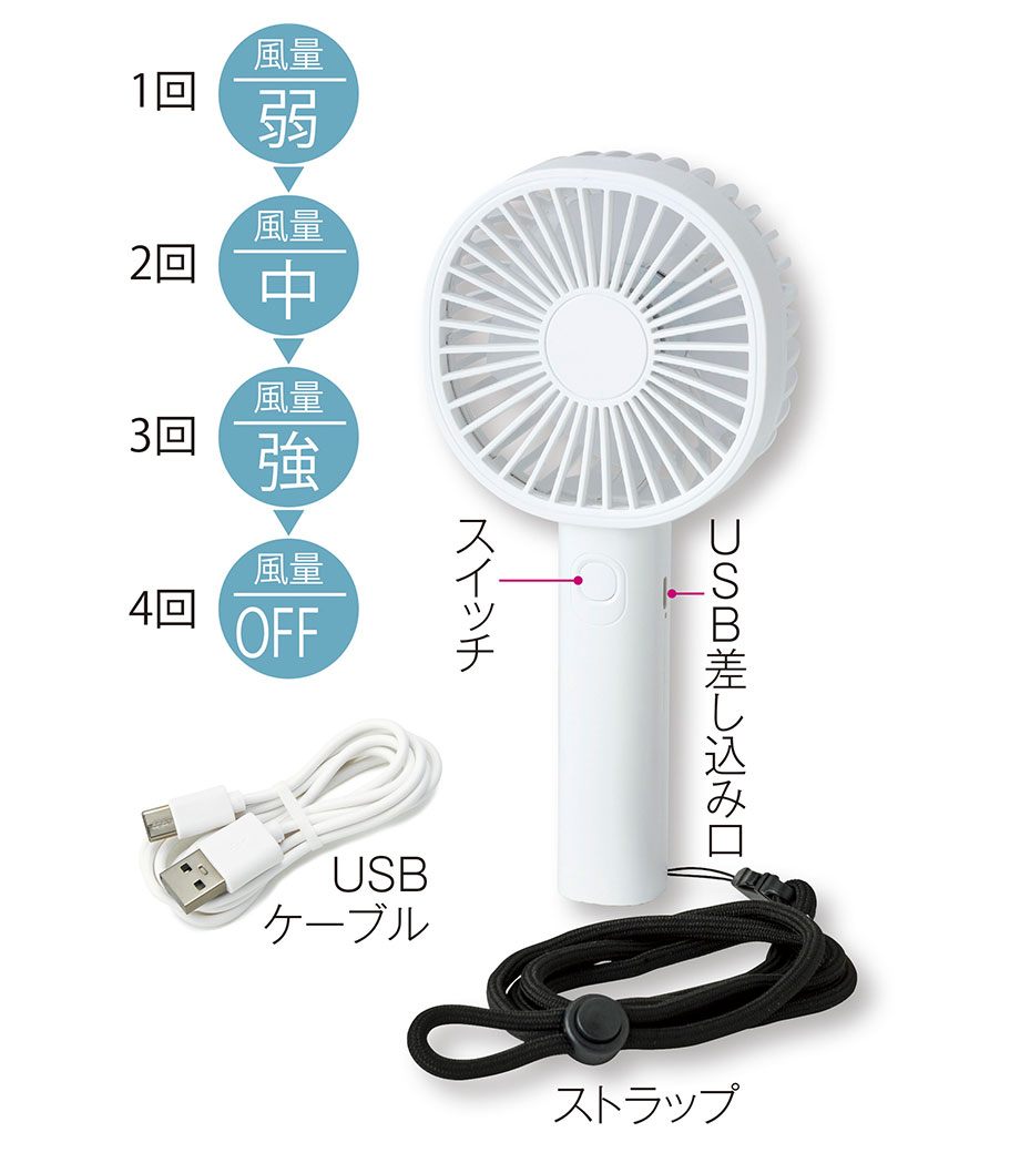 USB充電式で手軽に使えるハンディファンです。風量はボタンを押して3段階に調整できます。ストラップ付きなので外出先でも使いやすく、通勤・通学からレジャーシーンまで幅広く活躍。シンプルなデザインで年代性別問わず喜ばれます。