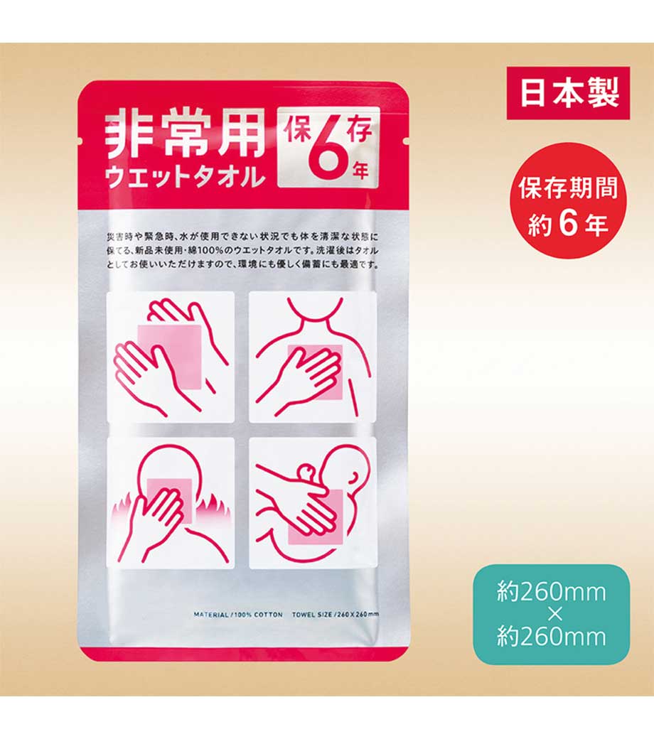 5年保存対応のウェットティッシュです。袋には耐光性・防湿性の高いアルミ蒸着の3層構造フィルムを採用。約20×30センチの大判のシートが10枚入っています。防災備蓄品としてはもちろん、非常持ち出し袋に1つあると安心のアイテムです。信頼の日本製なのもポイント。