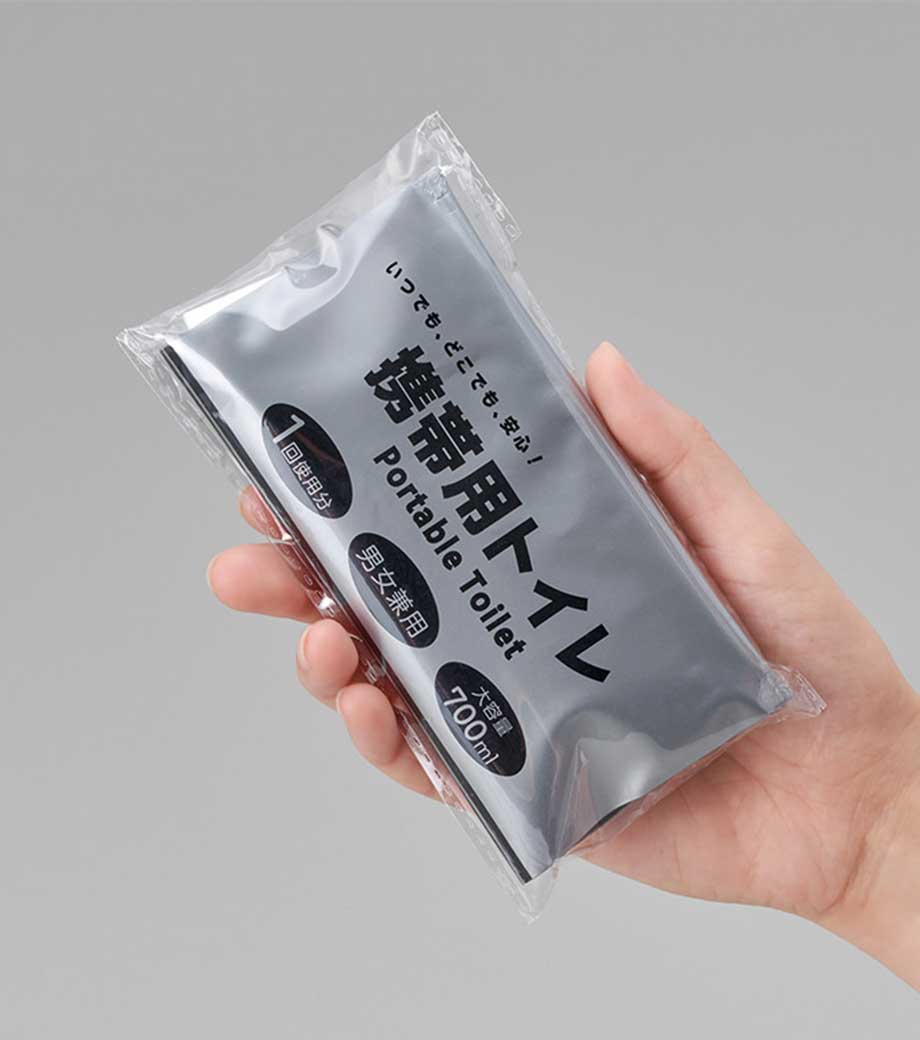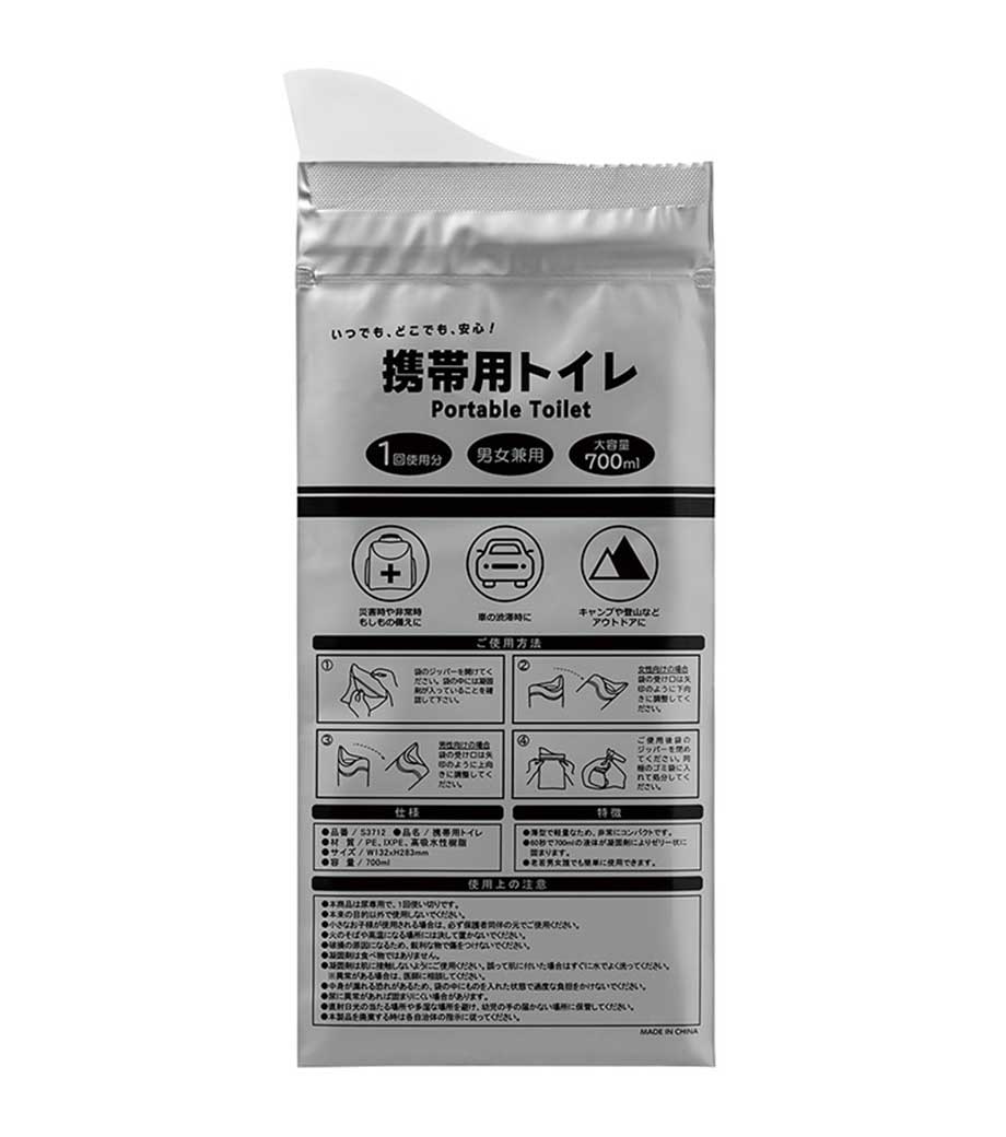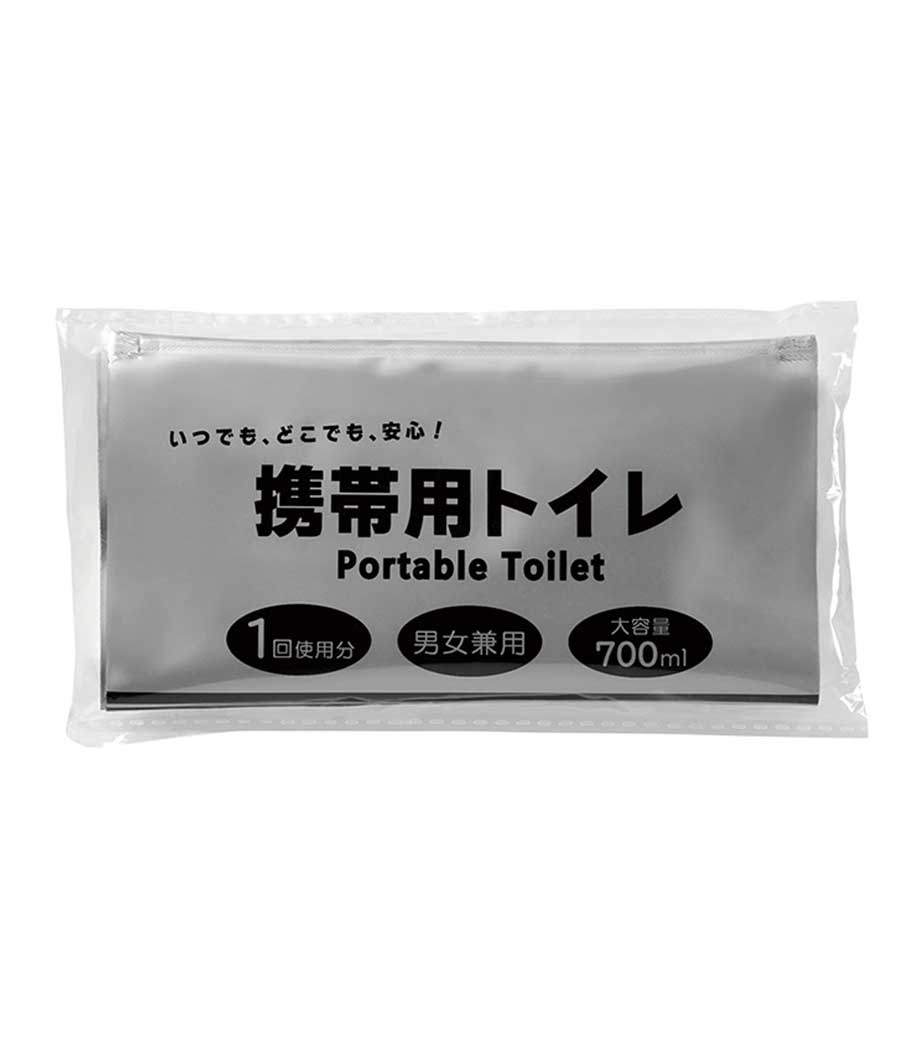非常時やレジャーシーンで役立つ携帯用の簡易トイレです。男女兼用でお子さまから大人まで安心して使えます。簡易トイレの備蓄目安は1人1日5~6個とされており、家庭や職場での防災対策にぴったりなアイテムです。使用後に処理しやすい廃棄用ビニール付きなのも嬉しいポイント。