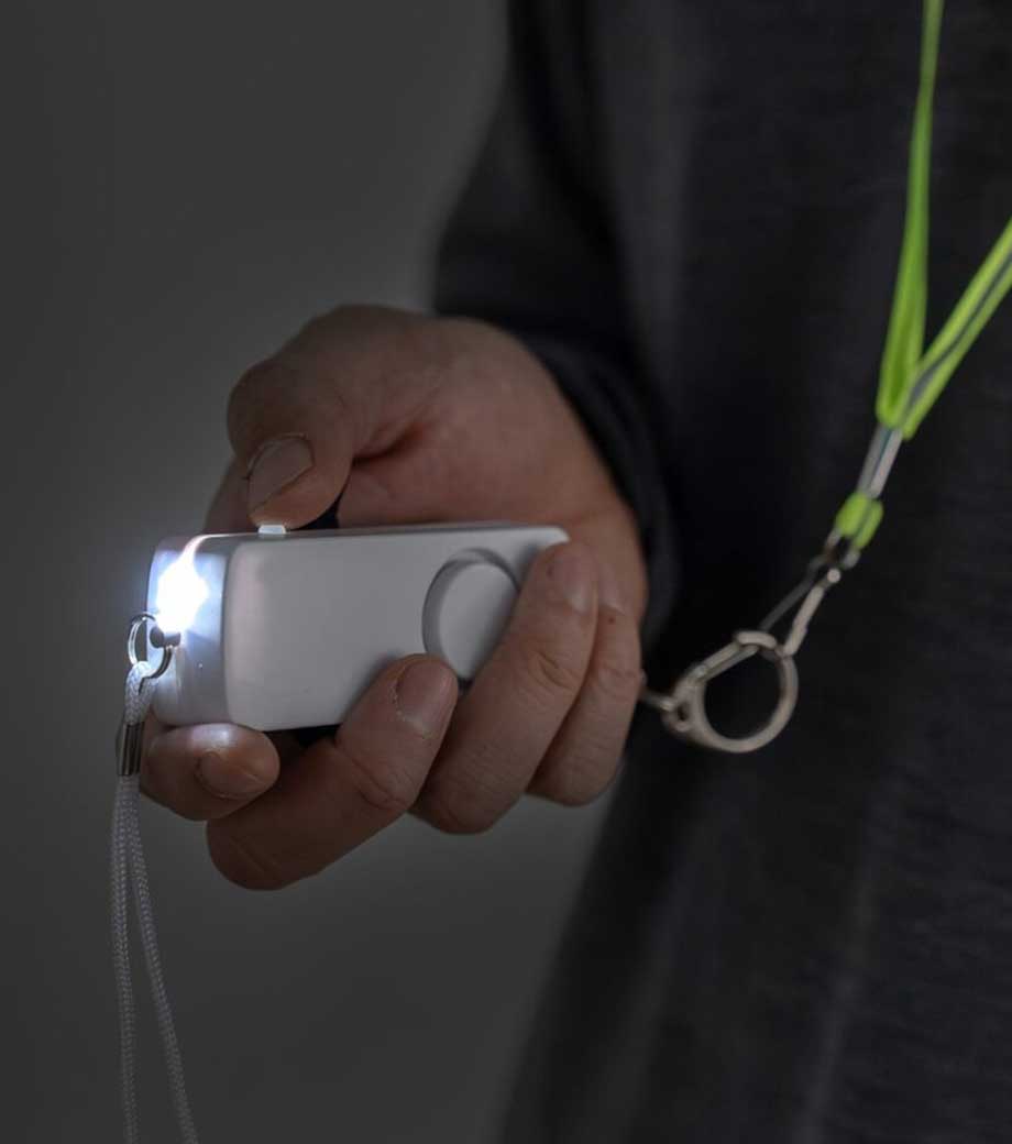ストラップ付ホイッスルライトは、3種のライトとホイッスルが合体したアイテムです。反射ネックストラップを首から下げて使います。