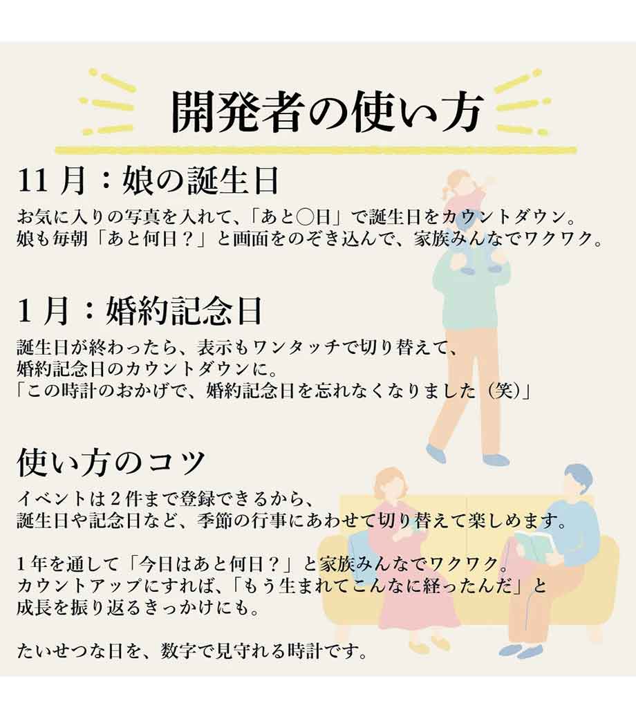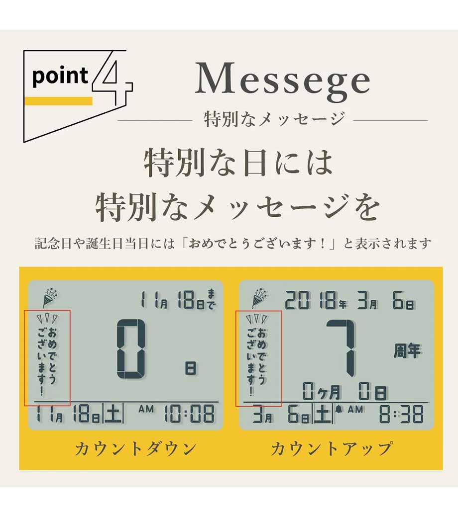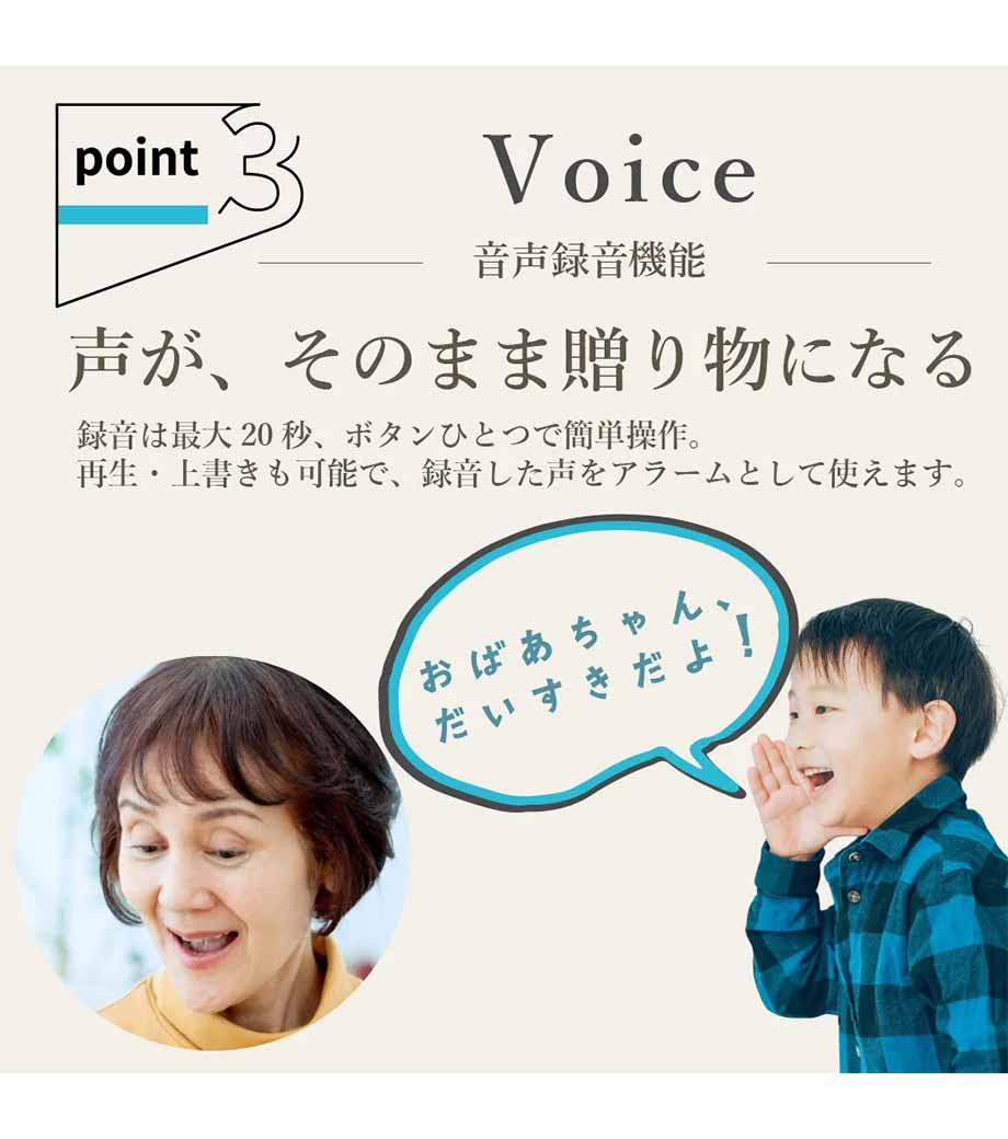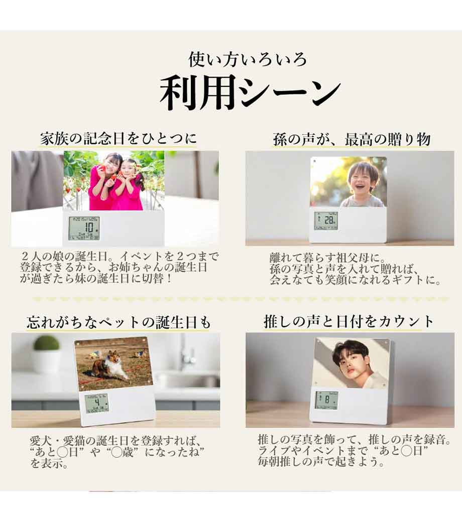 お気に入りの写真を飾れるフォトフレームクロック。L版・KGサイズに対応し、記念品にもぴったりです。録音した音声をアラームに設定できるので、推しの声や大切な人のメッセージで心地よい目覚めを迎えられます。イベントのカウントダウン・カウントアップ機能も搭載し、記念日や目標日までの日数を楽しく管理できます。