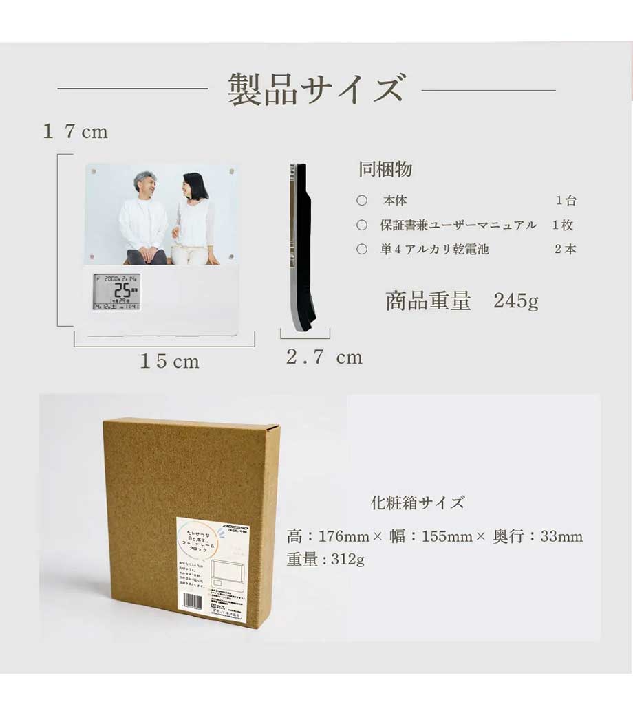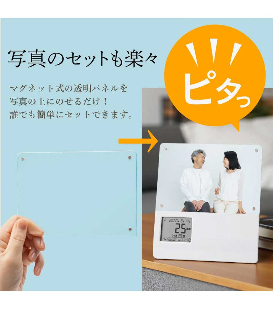 「フォトフレームクロック」は写真を入れてオリジナルの時計にできる記念品にぴったりのアイテム。時刻表示・カレンダー・アラーム・温度計・スヌーズの毎日に必要な機能をしっかり搭載しています。