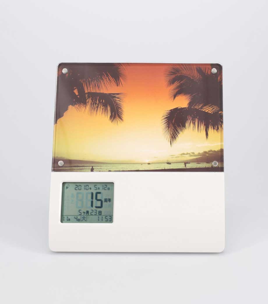 フレームはシンプルなホワイトで、印刷が映えます。目につく時計画面のすぐ横に、名入れができます。学校名や企業名を入れて、卒業記念や周年記念に人気のお品です。クラブやクラス、会社の思い出の集合写真をお仲間と共有できますね。時刻のほか、温度や日付を表示してくれ、アラームやスヌーズ機能も充実しています。