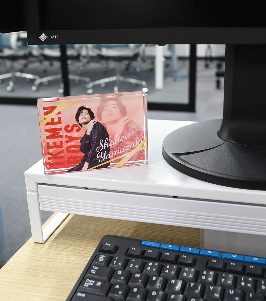 写真立てのように飾れて存在感のある、アクリル素材のフォトパネルです。フルカラーでイラストやアーティストの写真などをプリントでき、インテリアとしても映える仕上がりに。自宅やオフィスのデスクに飾ればインパクト抜群です。