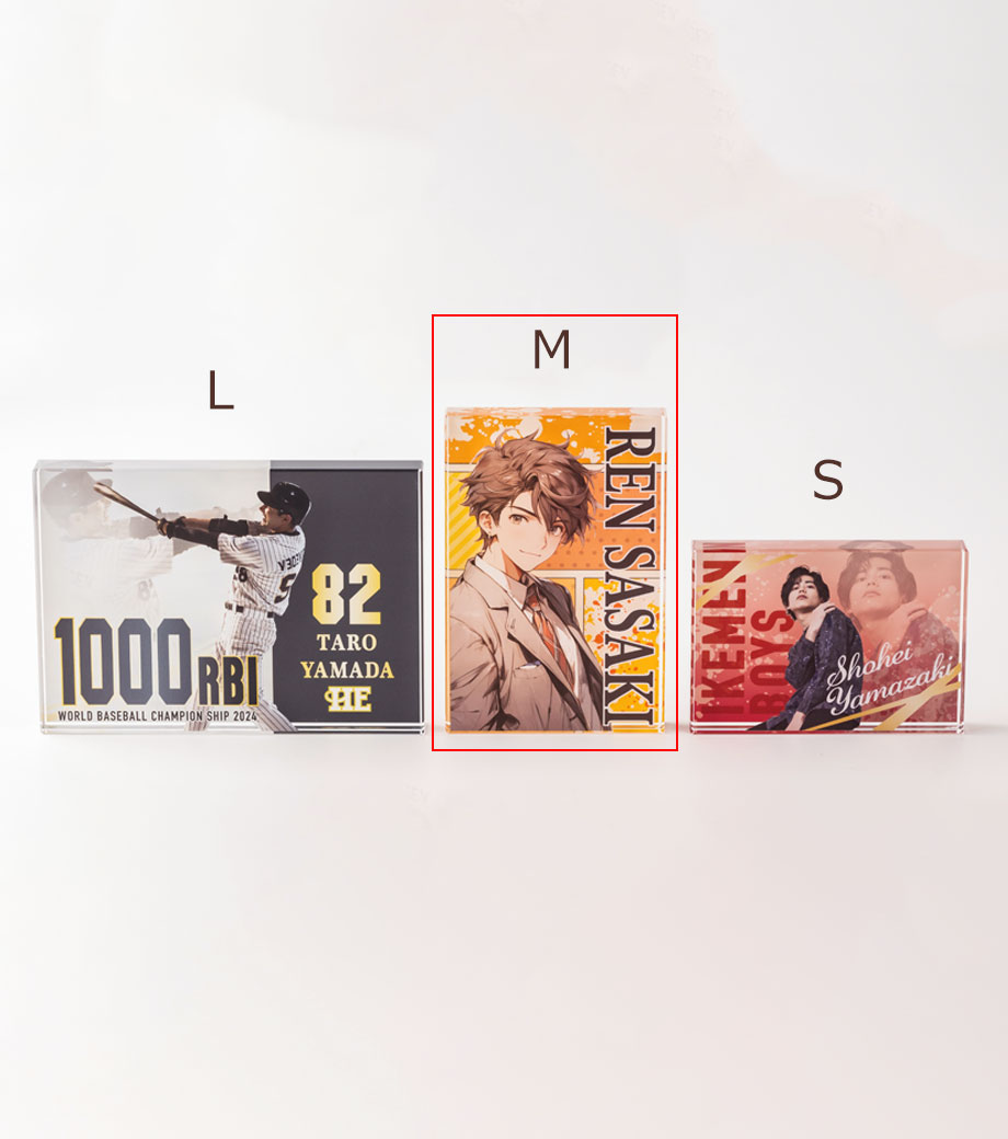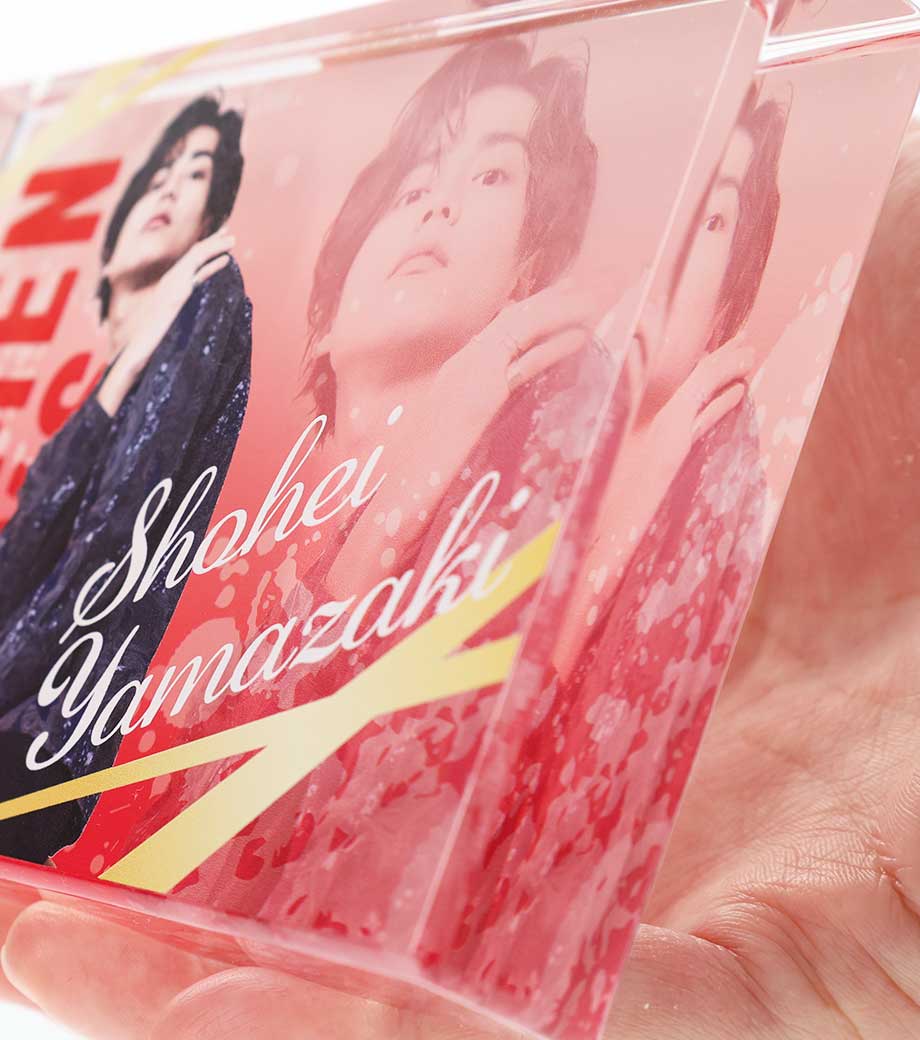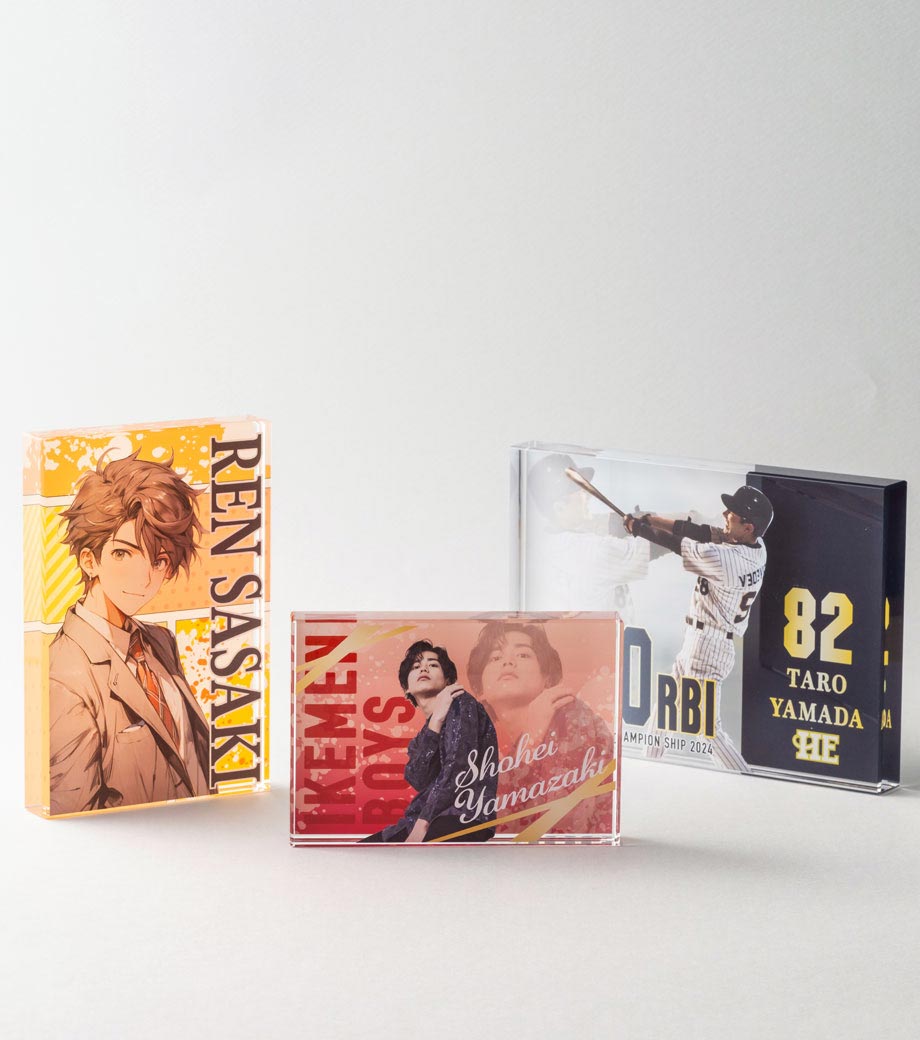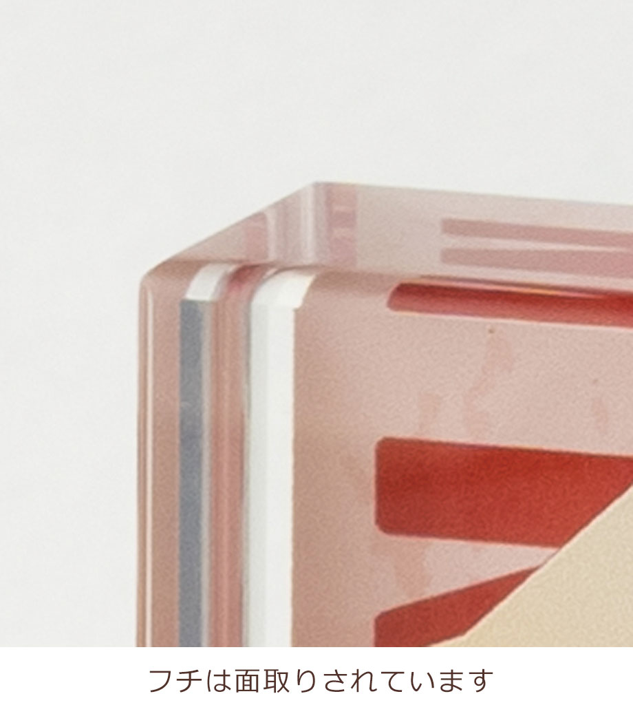 イラストや写真をフルカラーで印刷し、そのまま立てて飾れるアクリルブロックです。片面または両面に印刷できます。表面と背面で別々のデザインにして、奥行きのある表現も可能です。L判写真サイズで卓上にも飾りやすくなっています。フチは面取りされており、厚み20mmの重厚感がありながらもやわらかな印象です。