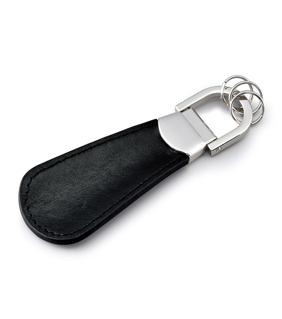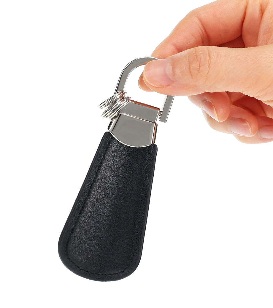 外出先で靴を履く際に便利な、キーホルダータイプの靴べらです。上質な牛革を使用しており、手に取るだけで高級感を感じられる仕上がり。キーホルダーとして使える輪っかが3つ付いているため、複数の鍵や小物をまとめて持ち歩けます。