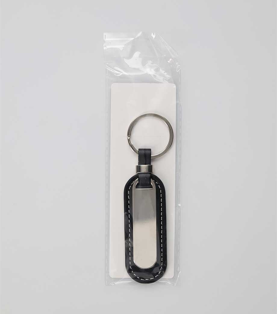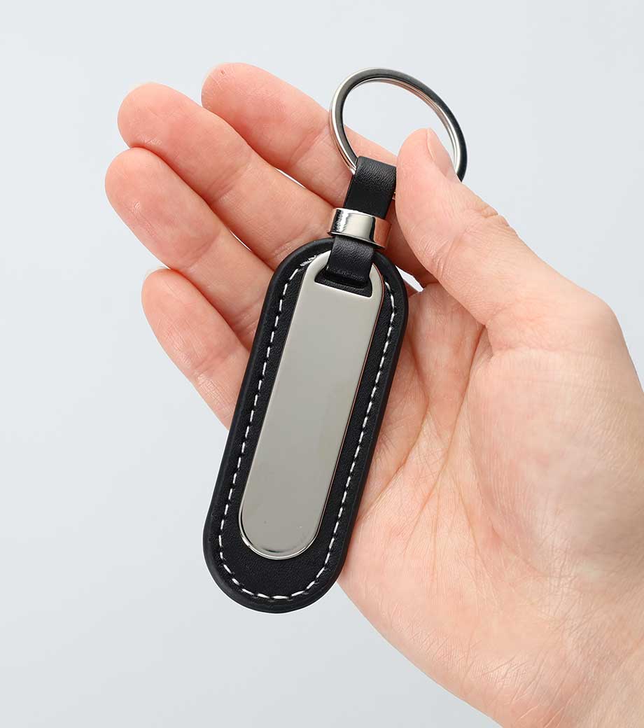 メタリックシルバーと黒のコンビネーションがシックな、プレート付キーホルダー。黒地に効かせた白いステッチもおしゃれです。お手頃価格ながらも高級感があり、販促用のノベルティから記念品まで幅広い用途にご活用いただけます。