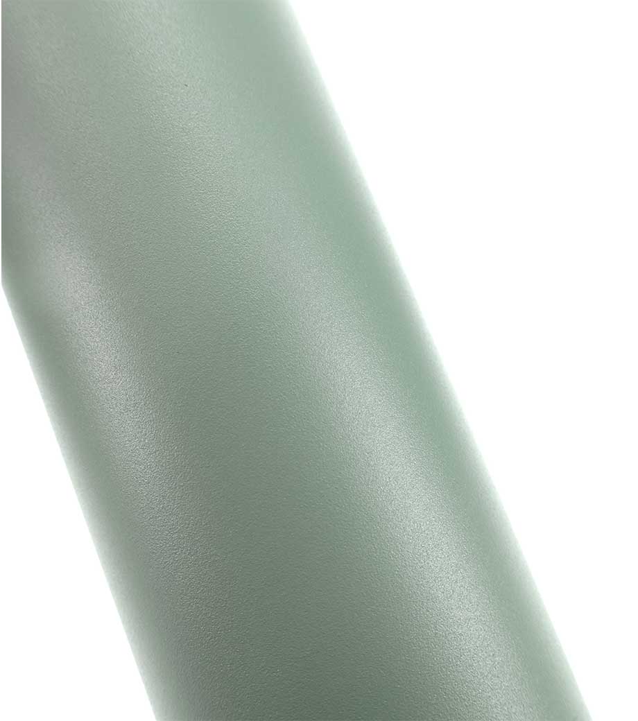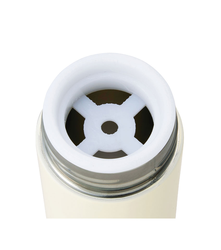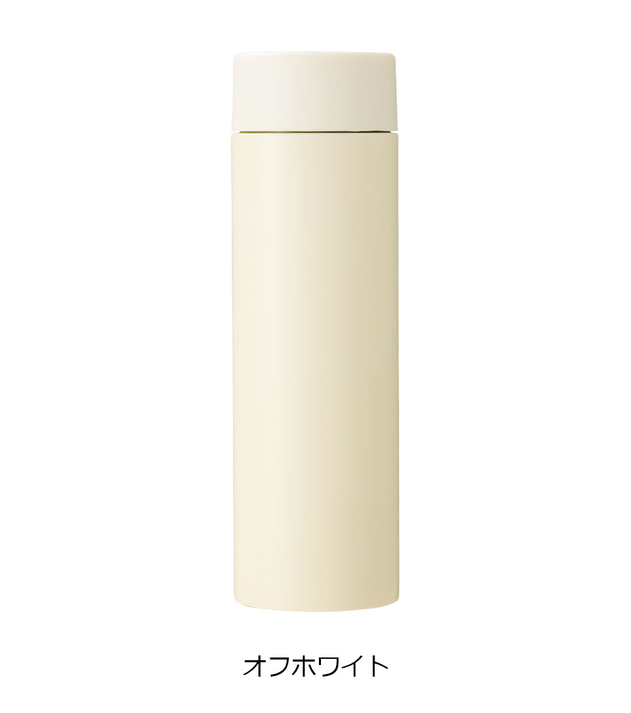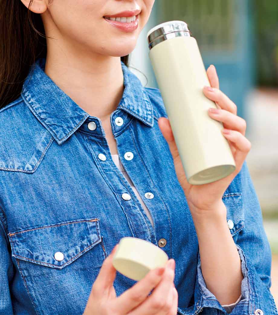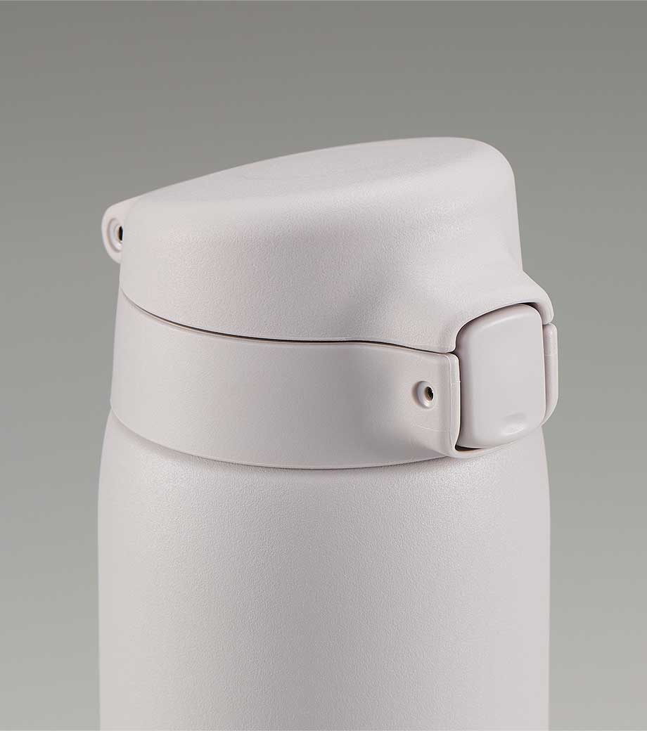 飲み頃温度を長時間キープできる真空二重構造です。広口でコップのような心地よい飲みやすさが魅力。蓋は持ち運びに便利なハンドル付きで、密閉しやすいスクリュー形状です。表面は少しザラっとしたマットな質感で、ニュアンスカラーがおしゃれ。