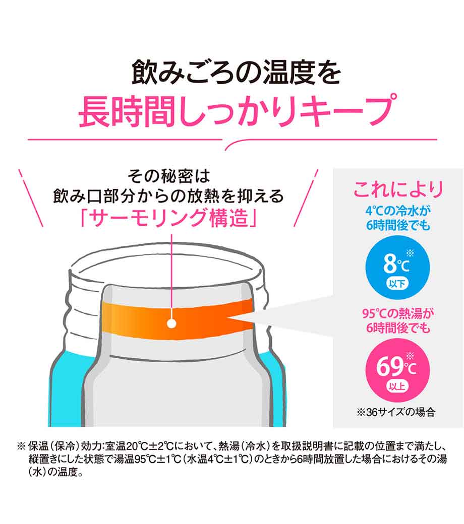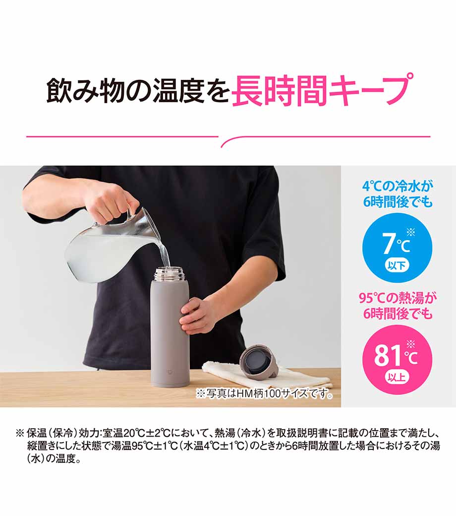 保冷・保温に優れた真空二重構造のステンレスボトル。JIS規格に基づく保温効力試験でも優れた結果を残しています。