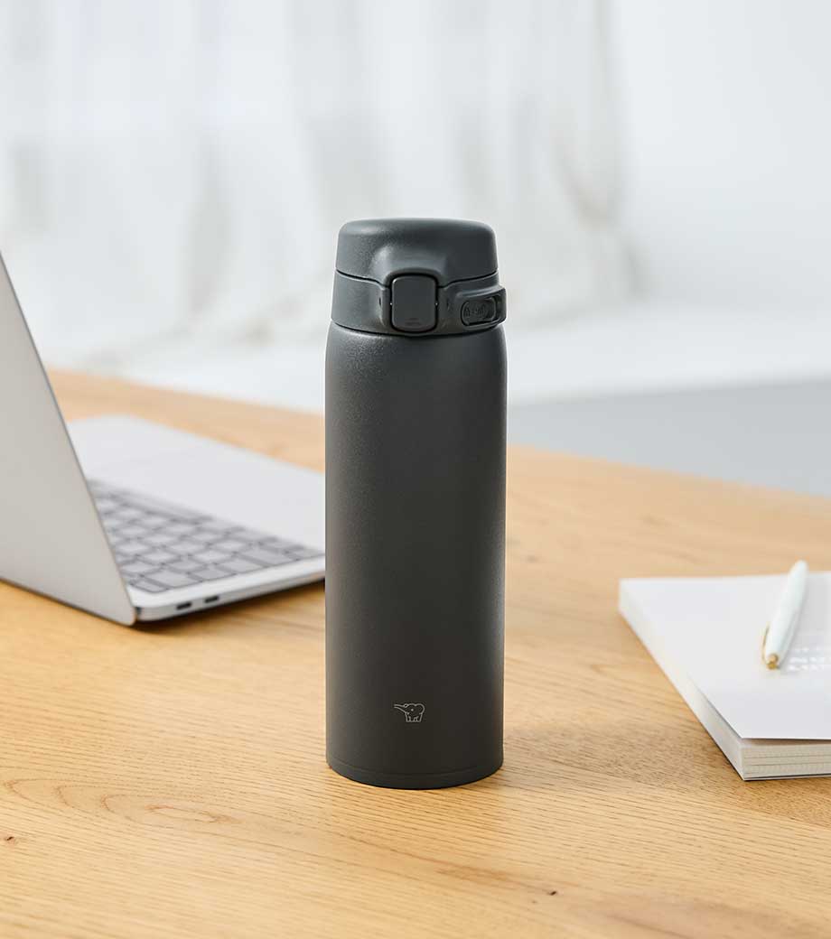 ワンプッシュで手軽に水分補給できる、真空構造の保冷温ステンレスボトルです。容量はペットボトル1本分の約500mlで、通勤・通学からスポーツシーンまで幅広く使えます。誤ってフタが開くのを防ぐスライドロック付きです。広口で氷を入れやすく、冷たい飲み物の温度も長時間キープ。底面にはすべり止めが付いており、デスクでも安定して置けます。