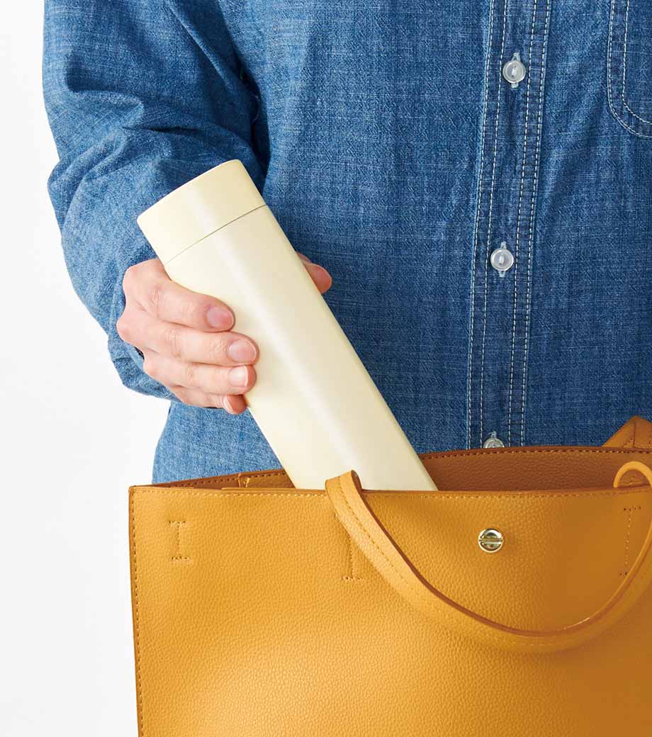 小さめのバッグやポケットに収まるので携帯に楽チン!シニアから若い女性層まで、お散歩時の水分補給や外出先でのサプリ・お薬用に便利と話題沸騰です。パプリカ1個分の約100gと超軽量だから、違う飲み物を2本持ち歩き!なんてこともできちゃいますね。シンプルなブラック・ホワイト、ゴージャスなシャンパンゴルードの3色をご用意。