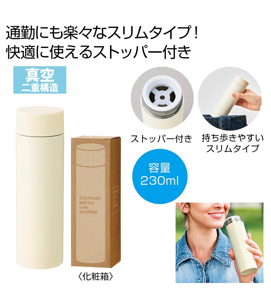 真空二重構造で、飲み物の温度をしっかりキープ!ちょっとしたお出かけにぴったりの容量230mlのボトルです。バッグにすっきり収まるスリムサイズ。飲み口は広めで、氷も入れやすくお手入れもラクラク。ステンレス素材でにおい移りも少なく毎日清潔に使えます。艶っとした本体カラーがとてもおしゃれです。