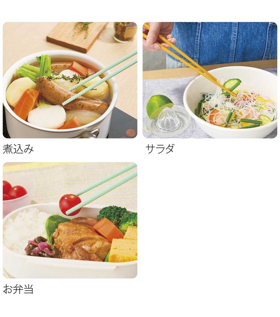 毎日の食卓づくりに役立つシリコン菜箸。シリコン素材でつるんとした麺類や煮物、炒め物の具材もしっかりつかみやすいのが特長です。滑りにくく扱いやすいため調理中のちょっとしたストレスも軽減してくれます。