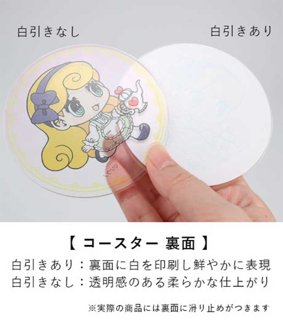 全面にフルカラー印刷ができる丸形のコースターです。色鮮やかな仕上がりはキャラクターグッズや同人グッズなどの細かなデザインも表現可能。表面はソフトタイプのポリエステル生地を使用しているため、紙やラバー素材のタイプと比べ吸水性があります。裏面はズレにくいラバー仕様です。