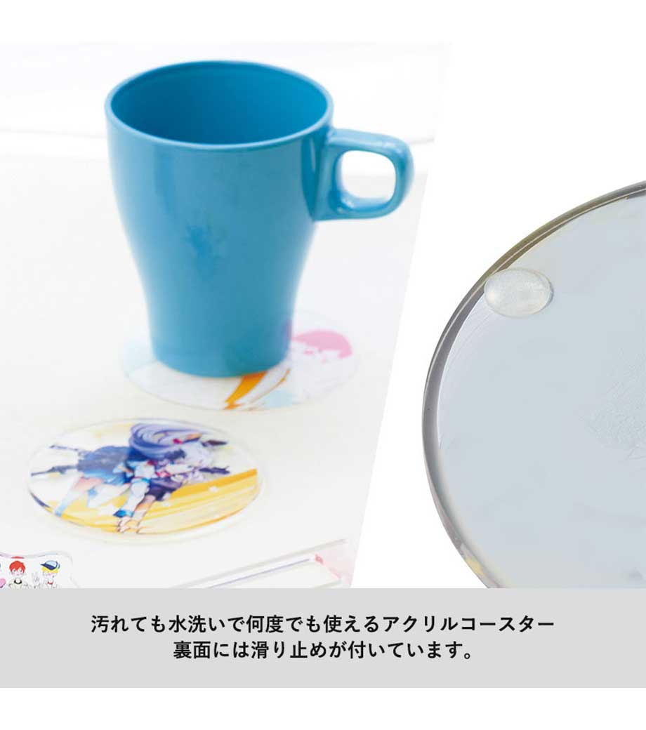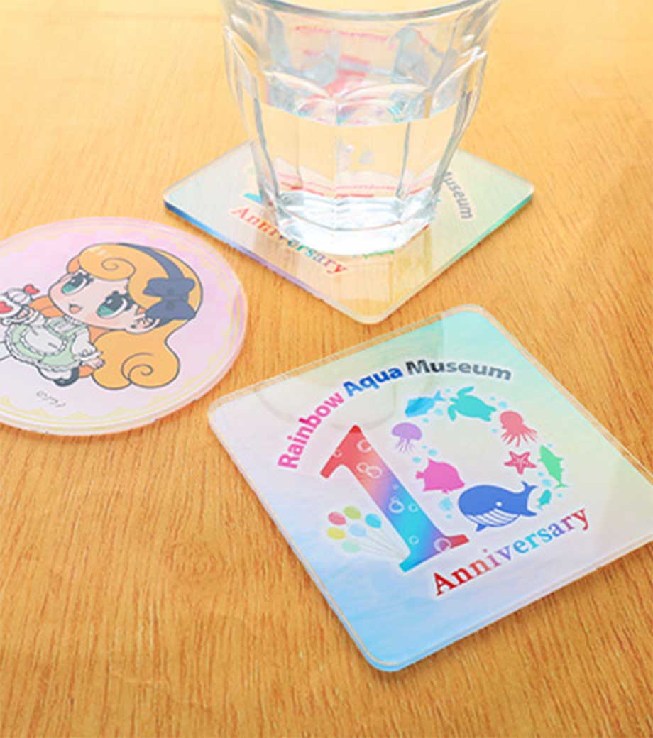 透明感のあるアクリル素材を使用した、見た目もおしゃれなコースターです。お好きなイラストや写真をフルカラーで印刷でき、SNS映えするノベルティやオリジナルグッズが作成できます。裏面には滑り止め付きで使用時も安心。汚れても水洗いできて繰り返し使えます。