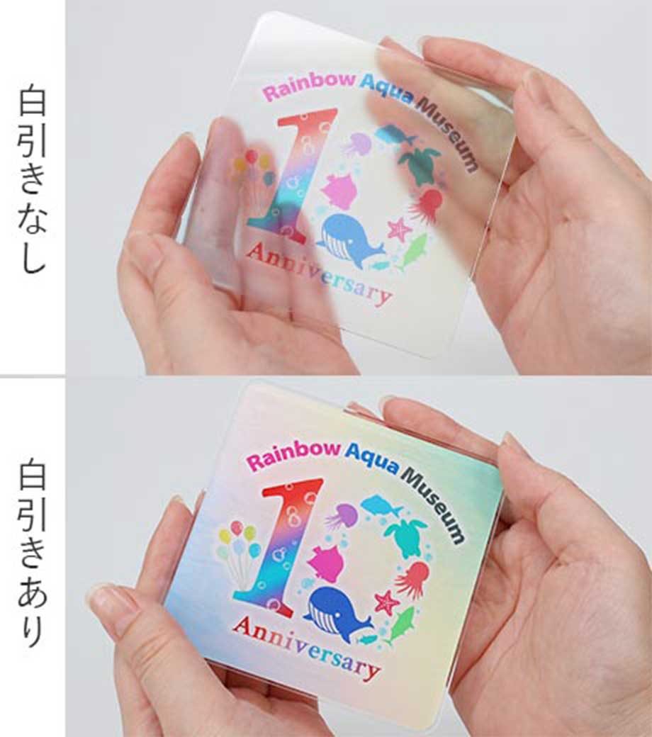 全面に熱で圧着させる昇華転写(フルカラー)印刷が可能です。ショップカードのように配布しやすく宣伝効果が抜群。ポスイトン可能なので資料と一緒に同封して送付もできます。店舗オープン記念品や同人イベント、キャンペーン特典など幅広いシーンで人気のノベルティです。