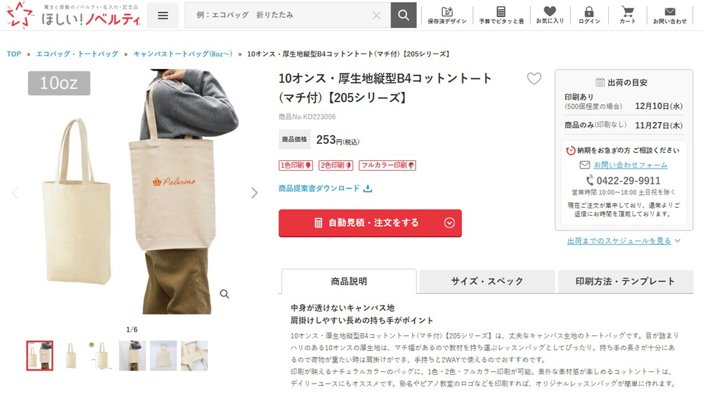 バッグを作りたいと思っていたので、オリジナルエコバッグ・トートバッグのページを見て、コットンバッグに決定しました。