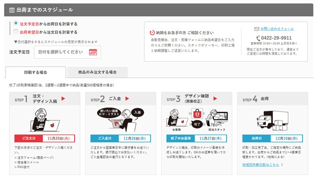 商品ページに印刷する場合のスケジュールが表示されているので、そちらを参考にしてみてください。