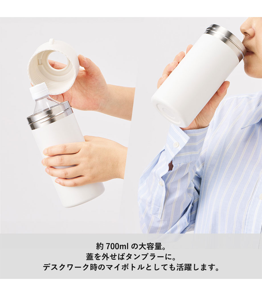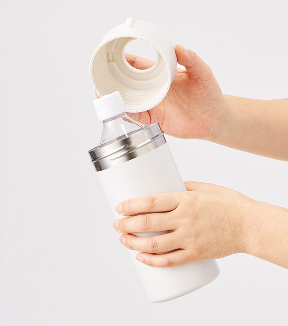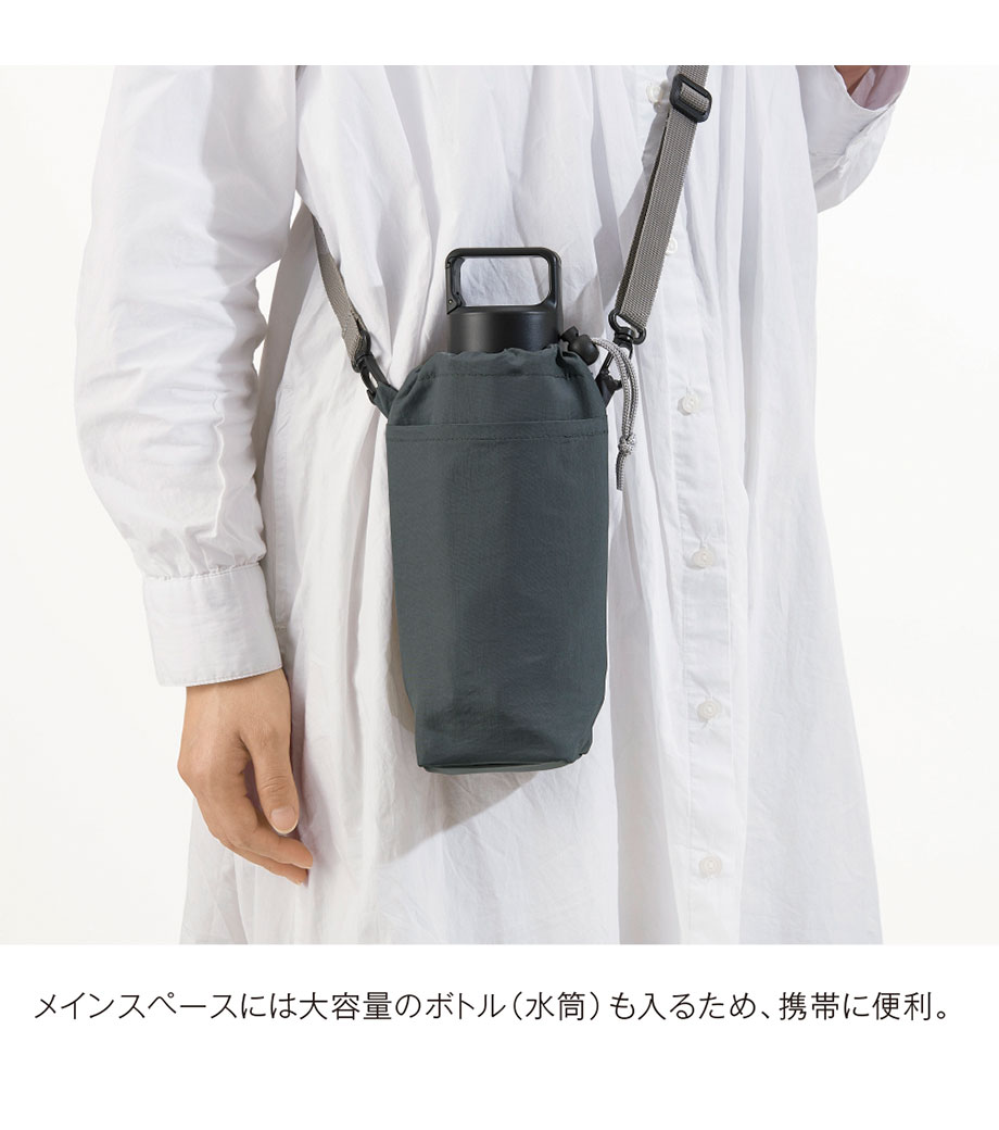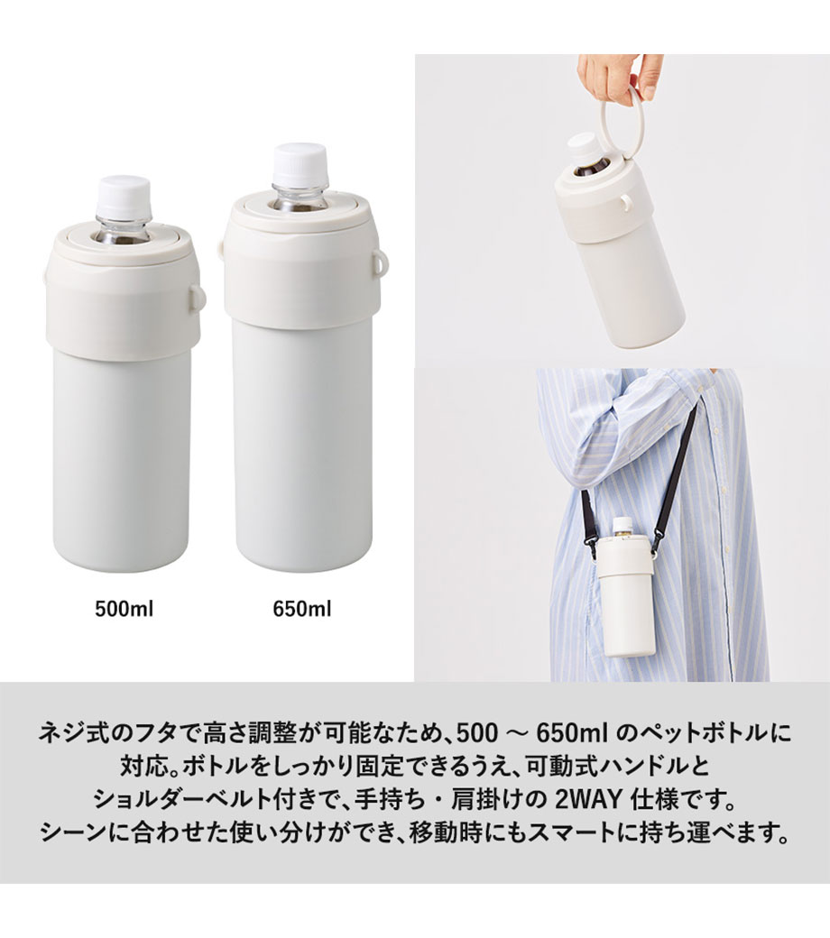 500mlのペットボトルが入るボトルカバーです。ハンドルに付いている取り外しできるバックルがポイント。カバンの持ち手や、リュックに取り付けて持ち運べます。カバンの中での結露対策にも〇。