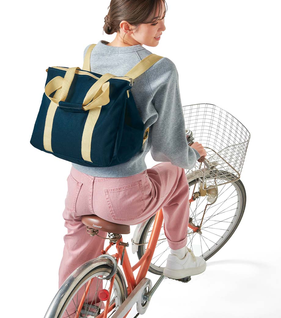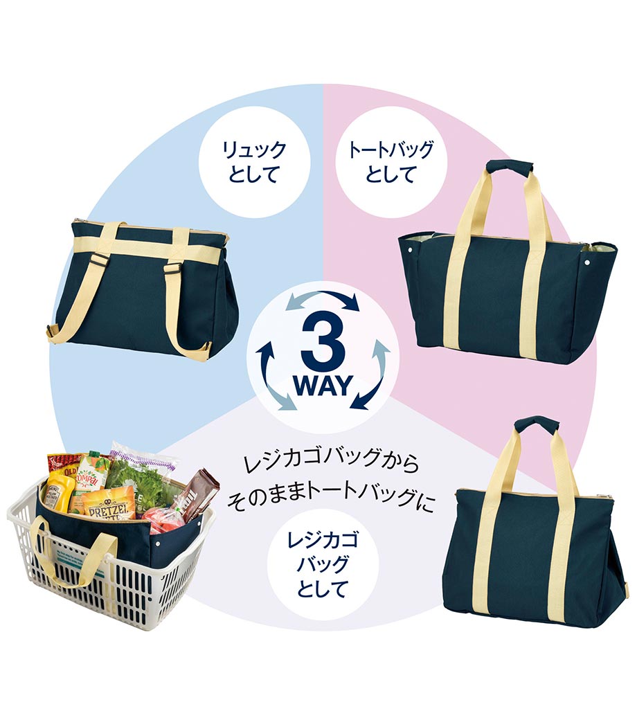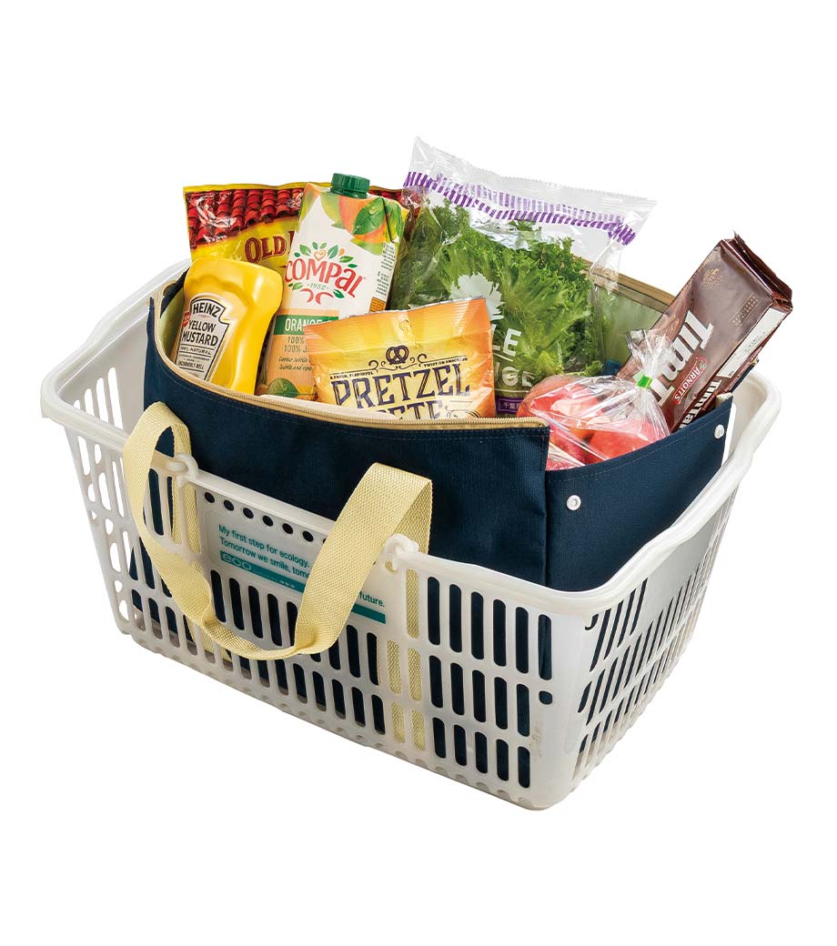 「レジかご対応!お買いものバッグ」は、スーパーのレジかごはもちろん、自転車かごにもすっぽり収まるサイズ。買った物を詰め替える手間がなく、ショッピングを楽々スマートに。バッグの内側は保冷温効果のあるアルミ蒸着加工で、食品の適温をキープ。間口は巾着仕様なので、中身が見えず、荷物がこぼれにくいので安心です。毎日のお買い物バッグにイチオシ!
