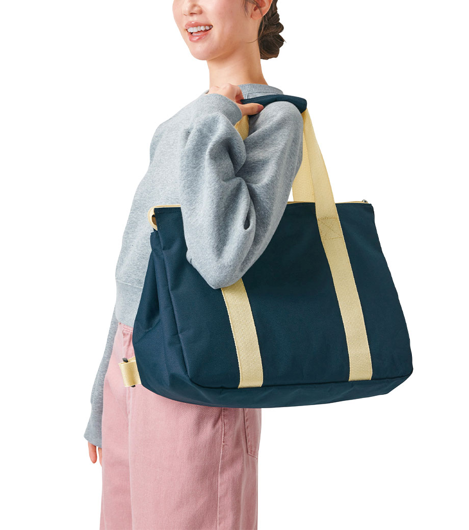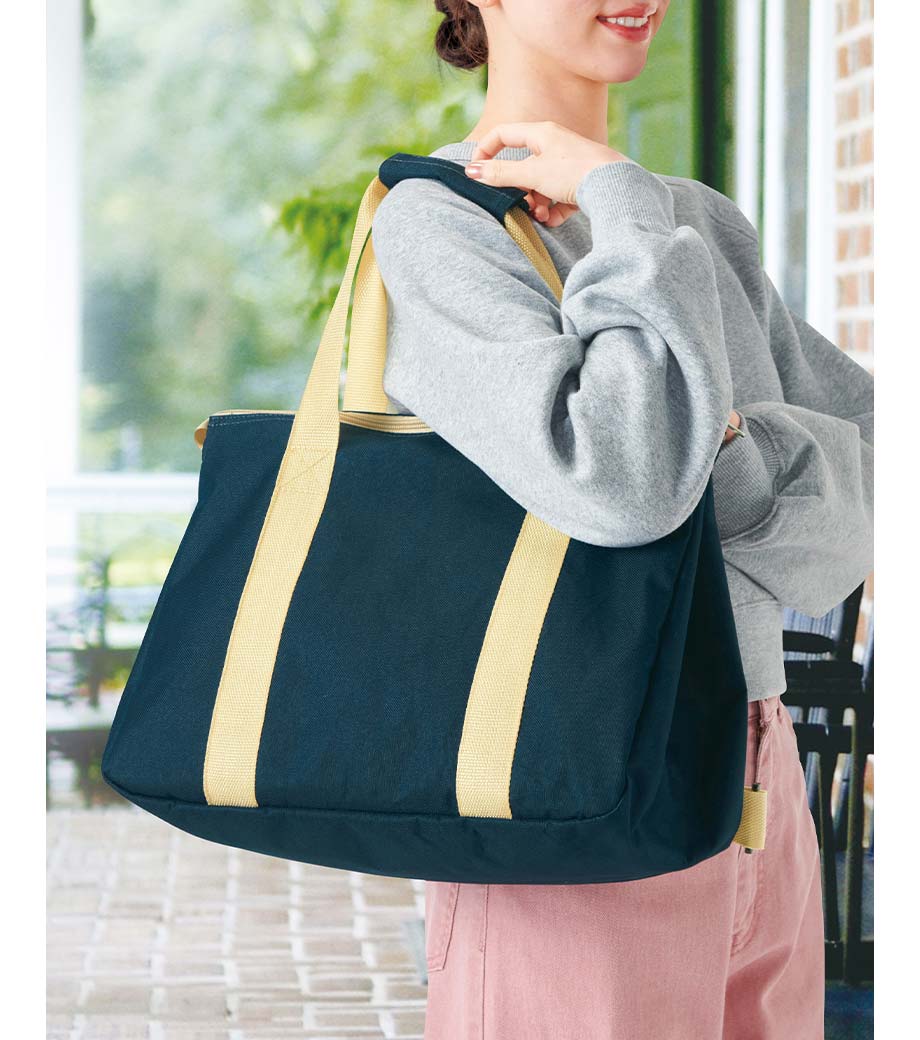 「保冷バイカラートート(M) 」は、暑い季節のショッピングやレジャーにぴったり。保冷効果があるので、冷凍食品やお弁当なども安心して持ち運べます。清潔感のあるアイボリーにアクセントカラーを効かせた、すっきりしたバイカラーデザイン。外ポケットが付いているので、スマートフォンやパスケースなどがサッと取り出せます。本体色は、ネイビーブルー・インクブラックの2色から選べます。