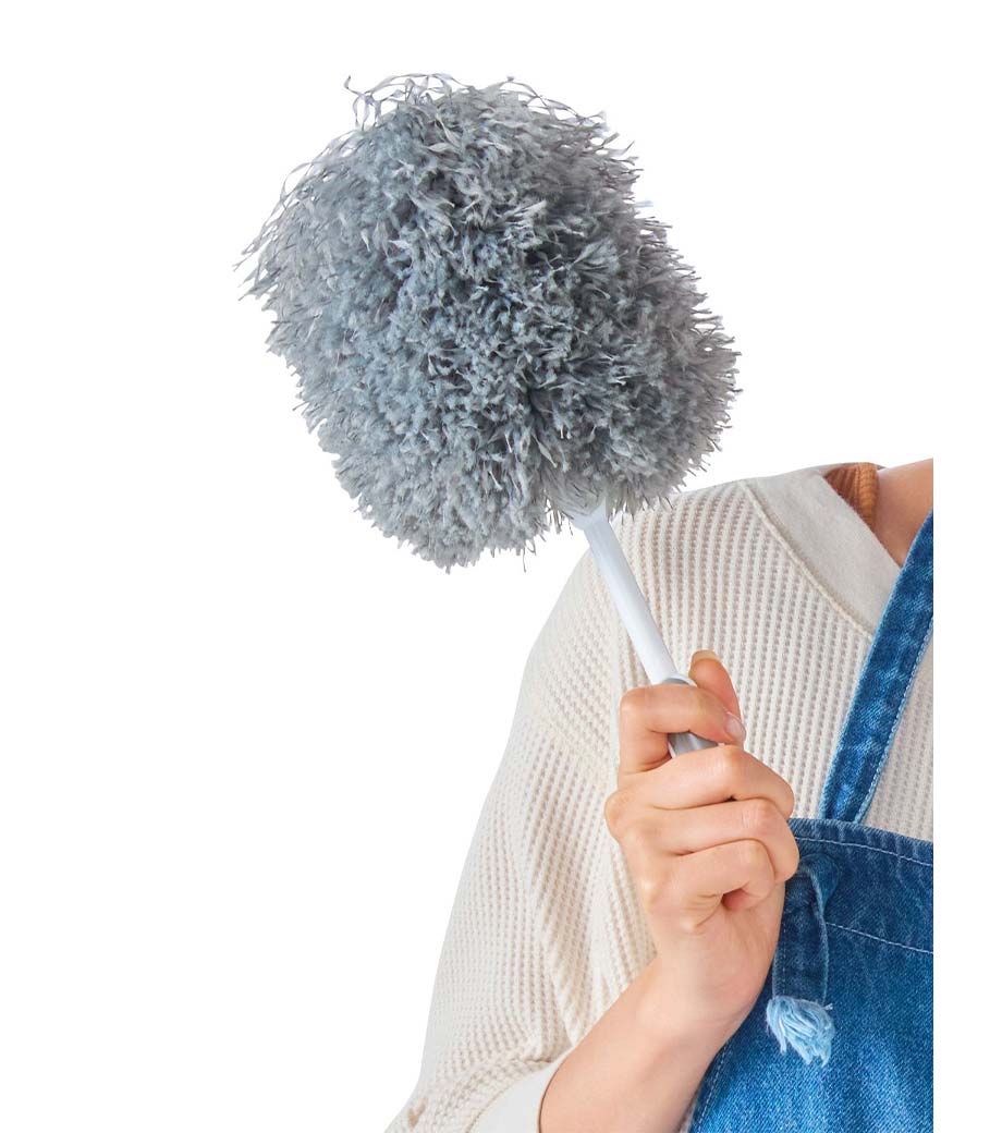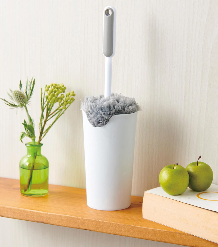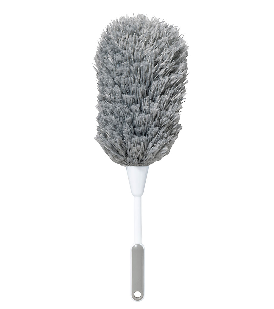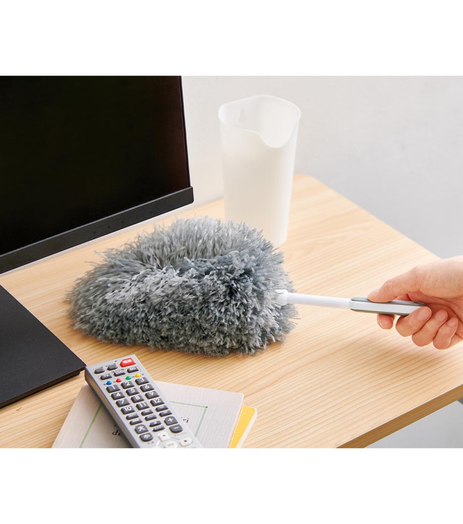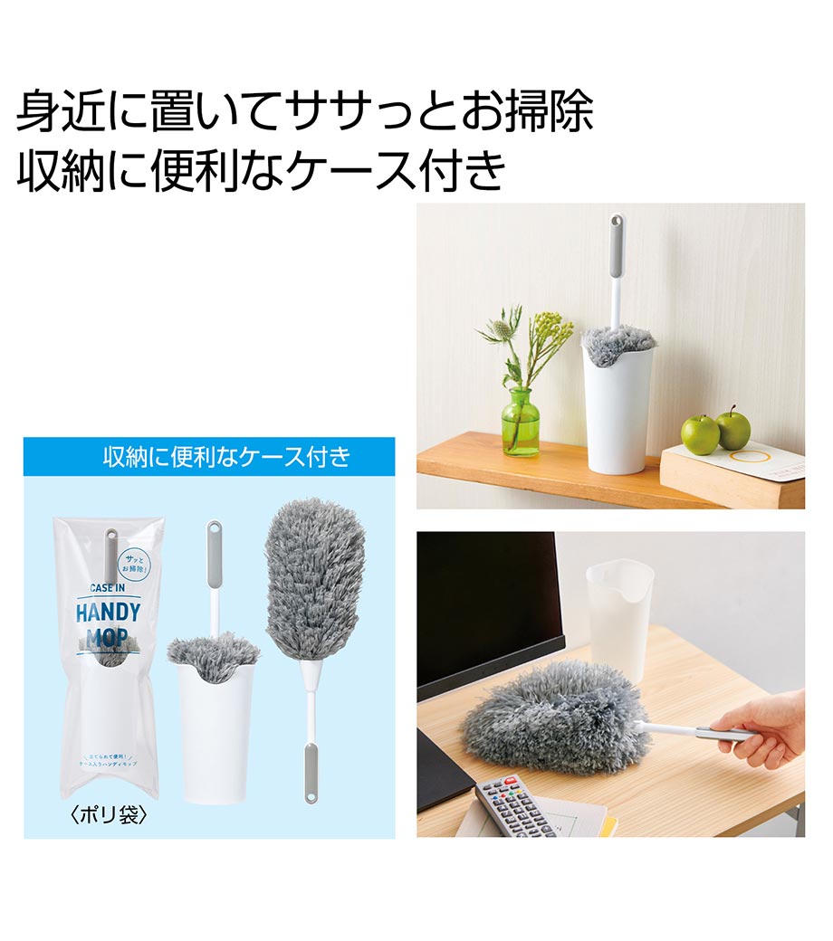 細かなホコリも絡め取るふわふわモップです。立てて置ける収納ケース付きで気づいた瞬間にサッと使える手軽さが魅力です。PC・家電まわりや窓枠、サッシ、本棚など幅広い場所で活躍します。