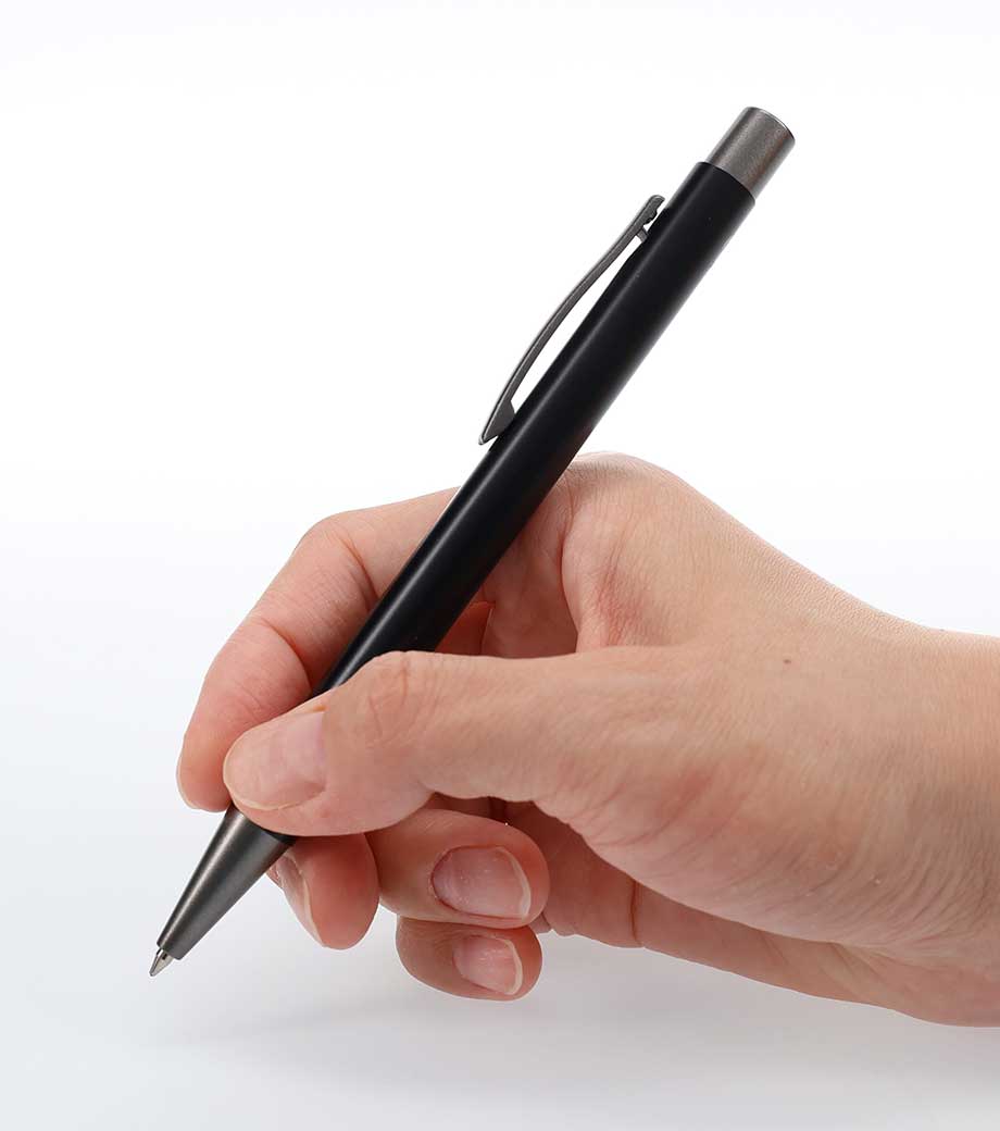シャープな印象のメタリック風カラーのボールペンは、4色からお好きな色を選べます。本体はわずか約6g!とても軽く、長時間の筆記も腕に負担がかかりません。