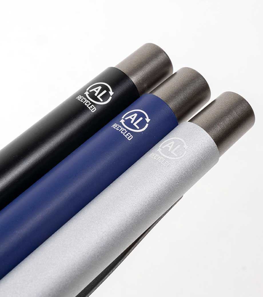 シャープな印象のメタリックボディのボールペン。本体をひねるとペン先が出てくるスタイリッシュな仕様で、側面のクリップはノートやメモ帳にしっかりと挟めます。不要になった廃プラスチックを再利用することで二酸化炭素を削減できます。環境に配慮したサスティナブルな商品です。