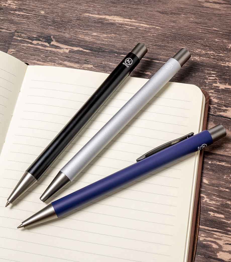 プラスチックは安価で軽量なのが特徴で、ボールペンでは最も一般的な素材です。フルカラー印刷対応商品も多く、幅広いデザインに対応できます。