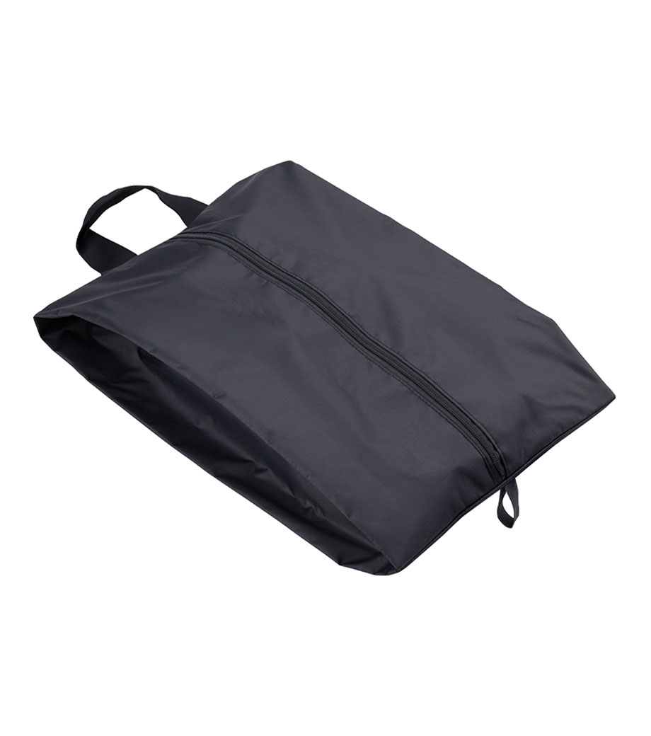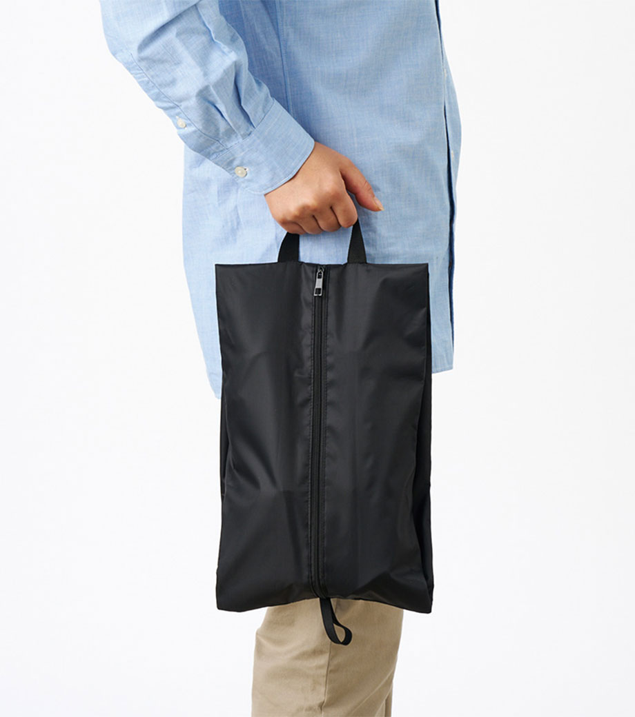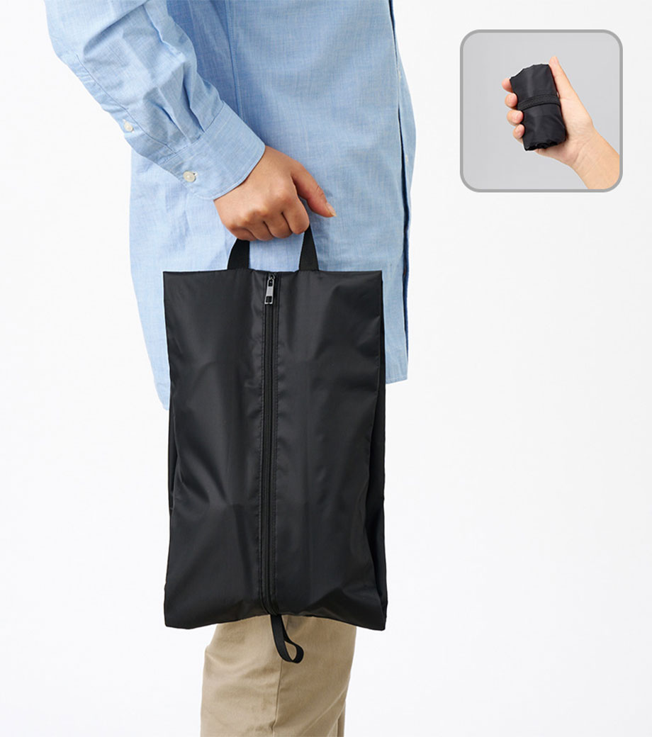 ハンドル付で持ち運びも便利なシューズケース。反対側にゴムが付いており使用しない時には畳んでゴムで留めればコンパクトサイズになります。内側はPVCコーティングが施され、簡単な汚れはサッと拭き取れて衛生的です。