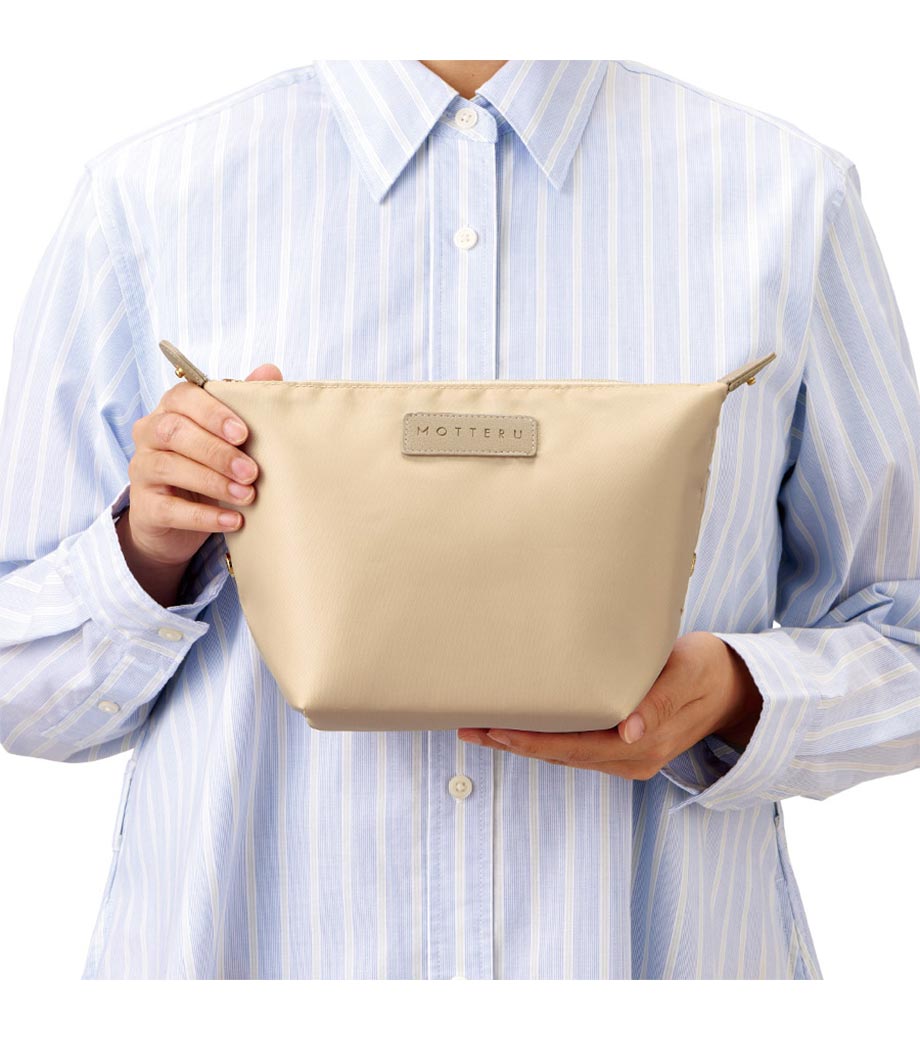 普段使いの洗面用具などが一式入るトラベルポーチです。化粧品のボトルがそのまま入るような余裕のあるサイズ感で出張や旅行にもぴったり。上部にメッシュポケットが2つ、下部はメッシュポーチに分れており、用途別に仕分けできます。ポーチの中は底板付きで、仕切りやベルトもありスッキリ収納。前後に付いた外ポケットにはマスクやミラーなどを入れられ便利です。