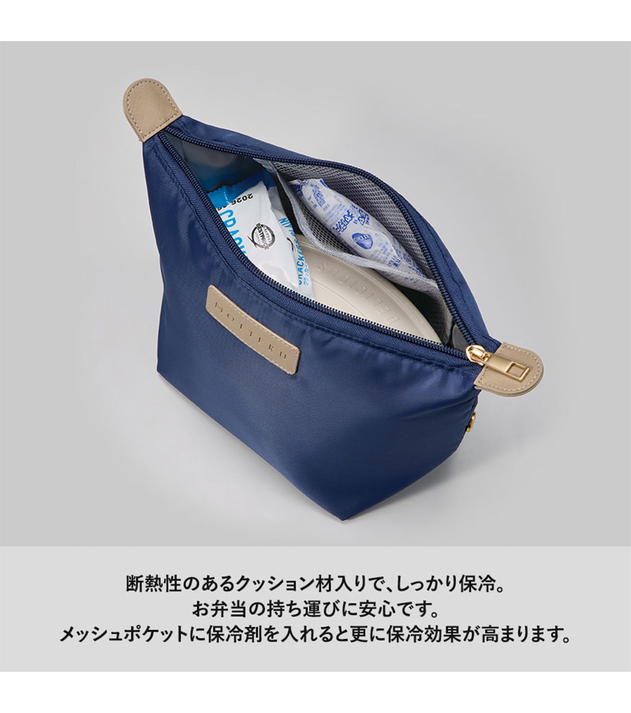 毎日のお弁当時間を快適にサポートしてくれる保冷機能付きポーチです。しっかりとしたマチがあるため、お弁当箱を安定して収納できるのが嬉しいポイント。