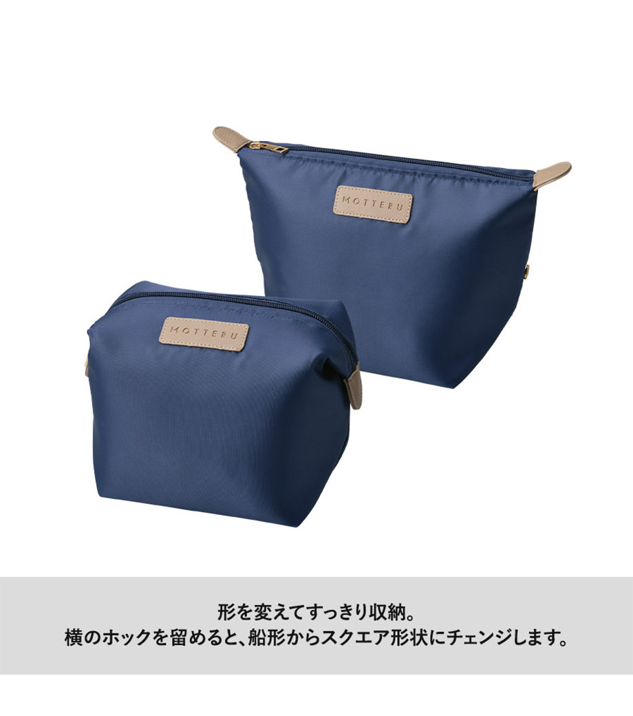 さらにサイドのホックを留めれば舟形からスクエア型へと形状を変えられ、シーンに応じた使い分けが可能です。内側にはメッシュポケットも付いており保冷剤や小物の整理にも便利。