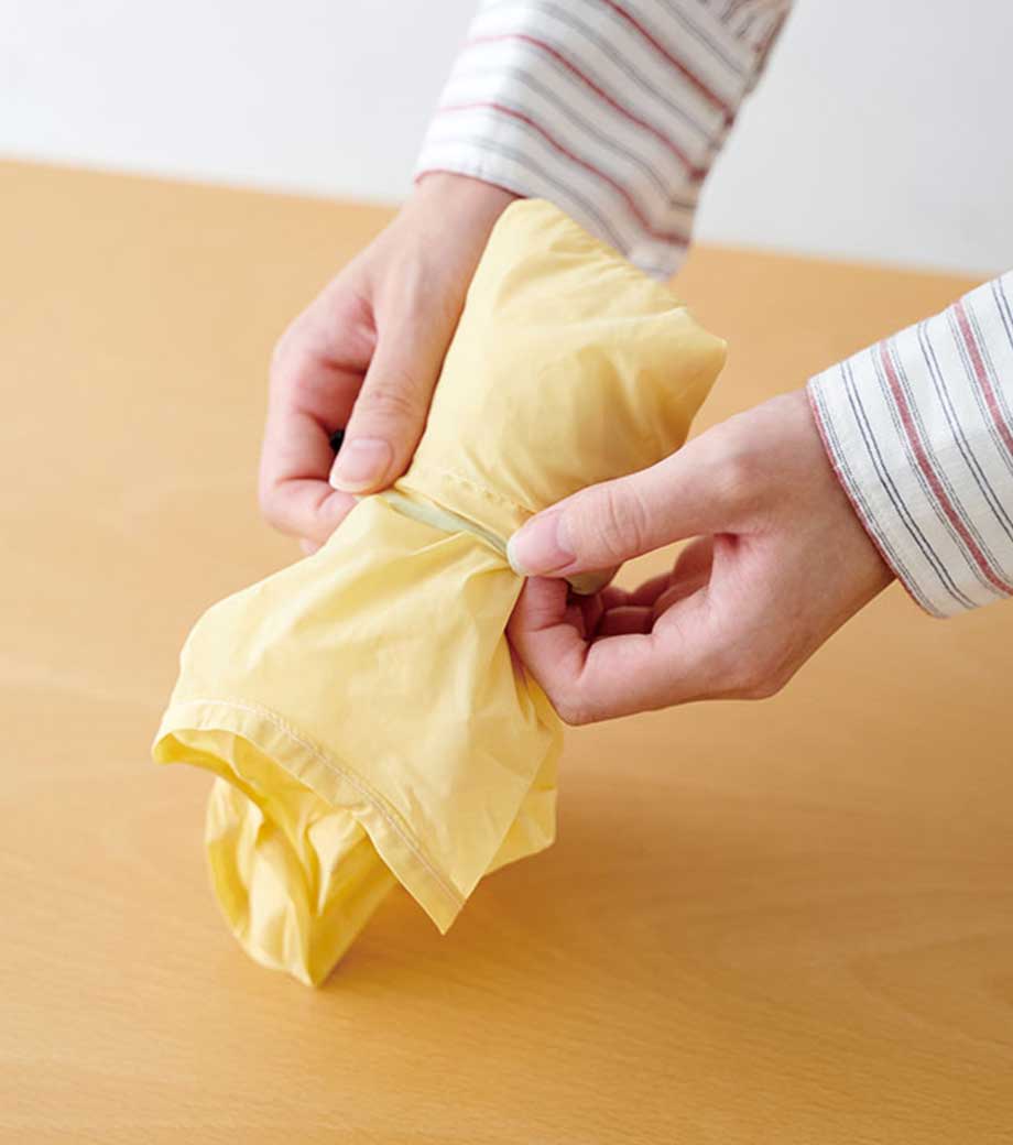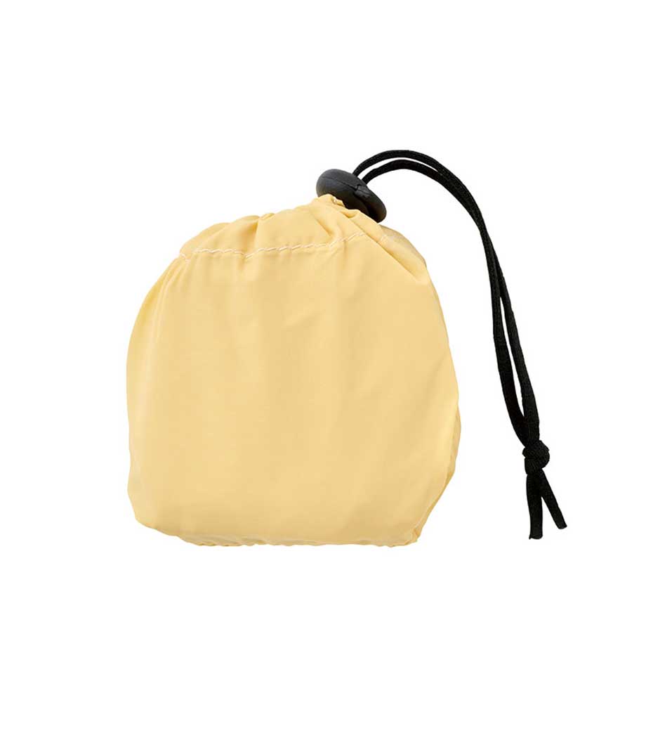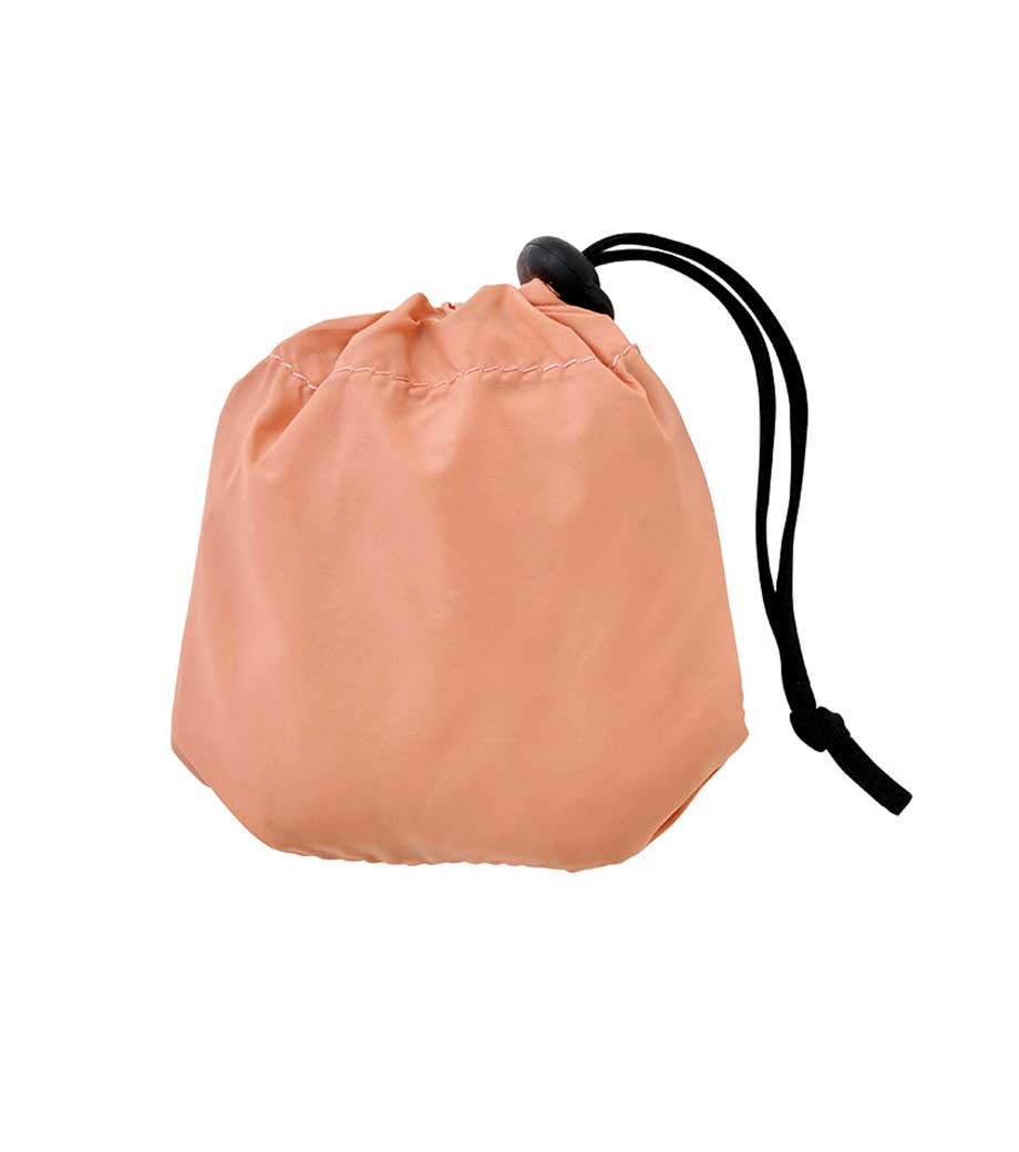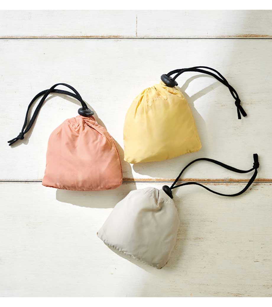 前面のポケットを裏返してたたみ込めば、一瞬でコンパクトに!持ち運びに便利です。紐付きの間口で、中身の広がりを抑えられるのも使い勝手がよいですね。