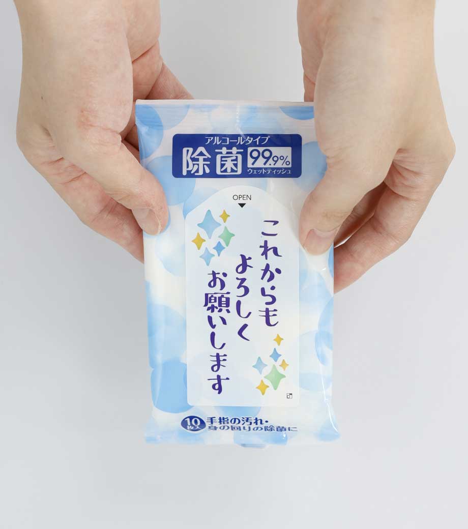 ウェットふきんは10枚入りで、99.9%の除菌率!ポストインもできるパッケージサイズで、直接ご挨拶ができないお客様にも郵送でお渡しできますよ。