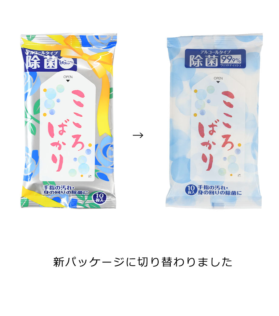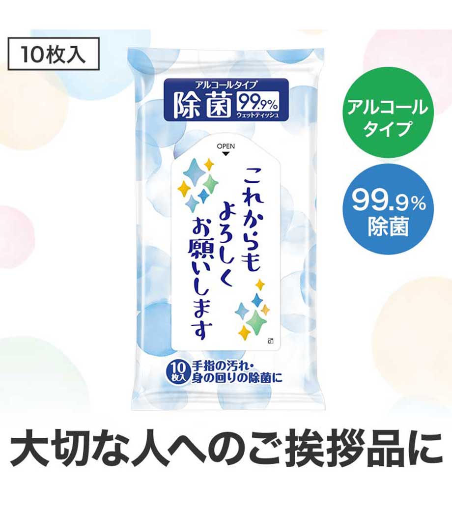 これからもよろしくお願いします 除菌ウェットティッシュはアルコール濃度30%配合の携帯ウェットティッシュ。10枚入りで手や指、身の回りの汚れをすばやく拭取り除菌します。フラップシールはメッセージデザイン入り。リボンとバラが書かれたパッケージも華やかですね。