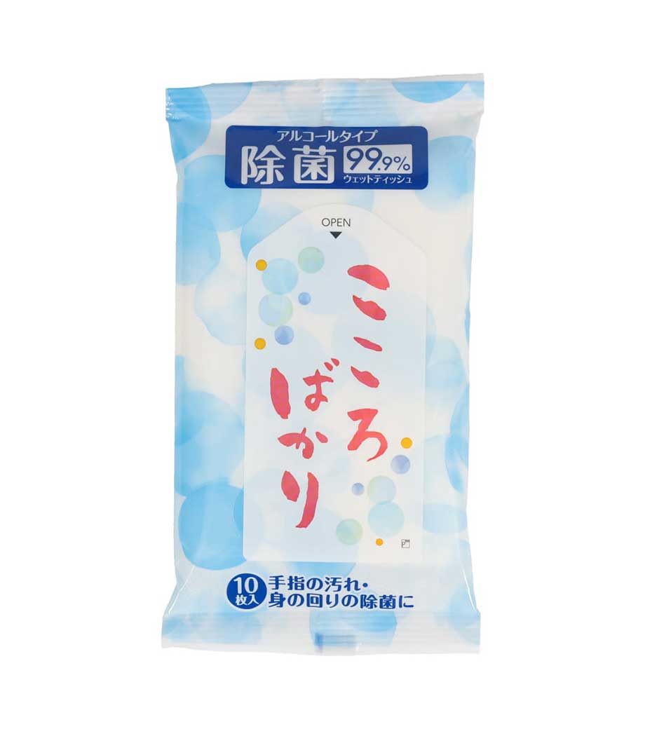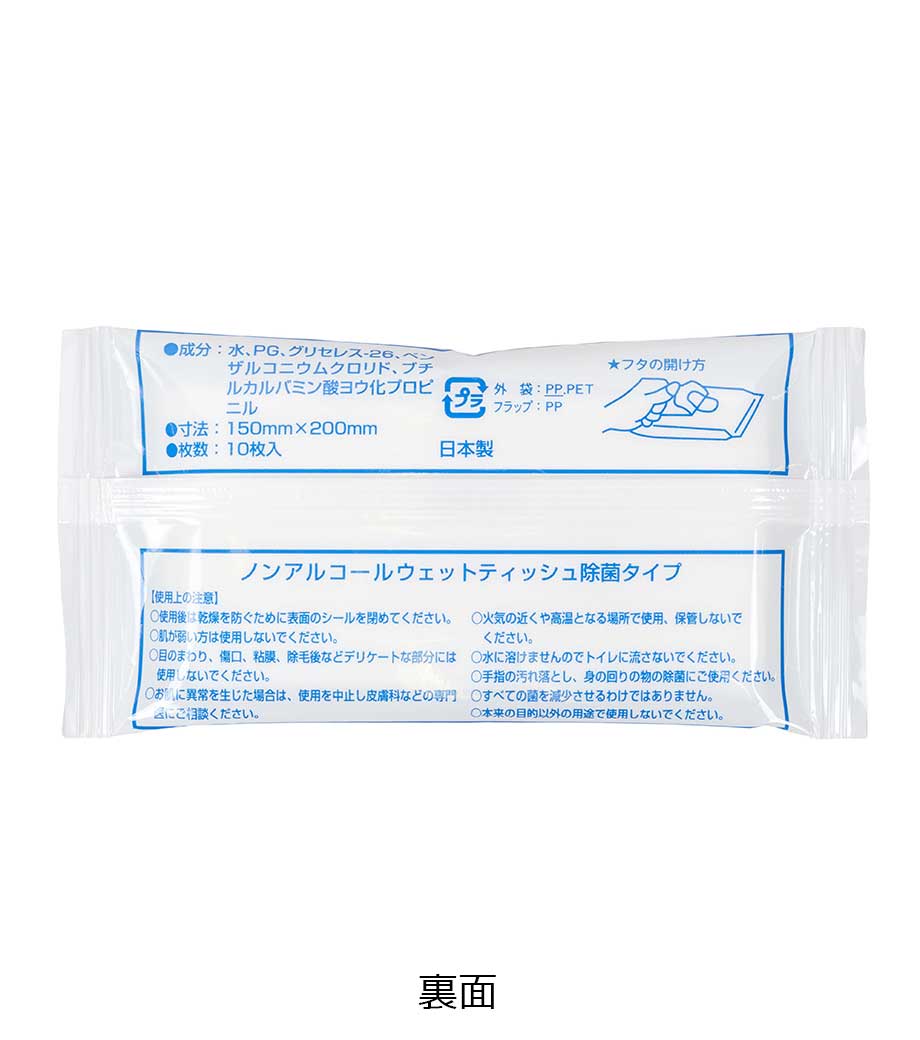 除菌ウェットティッシュ(10枚入)【既製品】は、いまや生活必需品となったお手軽サイズのウェットティッシュ。お食事前の手の除菌や机の汚れを拭いたり、気になったときにすぐに使えて便利です。安心の日本製なのもポイントです。