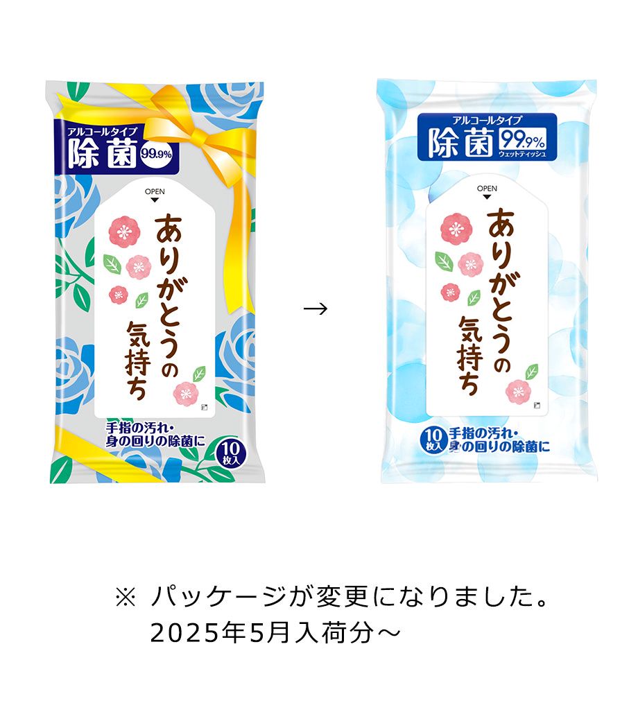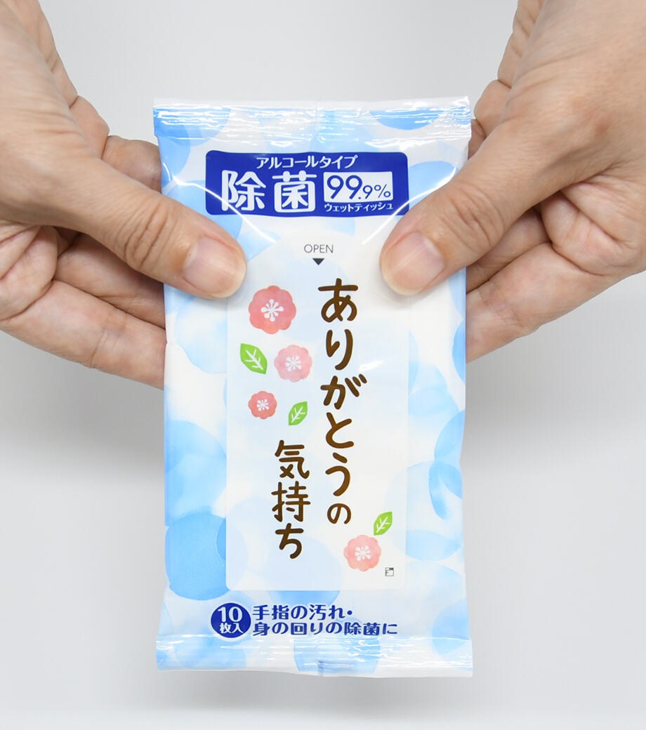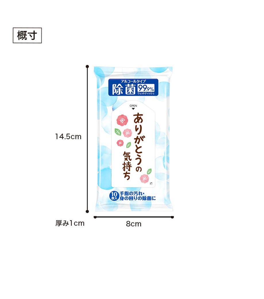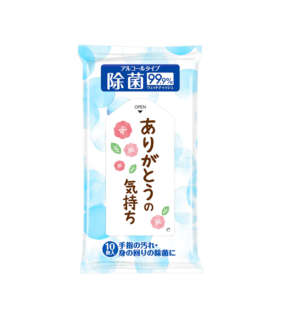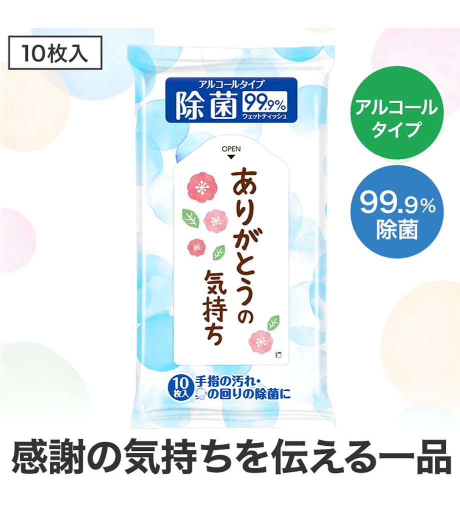 ありがとうの気持ち 除菌ウェットティッシュはアルコール濃度30%配合です。10枚入りで手や指、身の回りの汚れをすばやく拭取り除菌します。フラップシールには感謝の気持ちのメッセージデザイン入り。コンパクトなので鞄やポーチに入れてもかさばりません。
