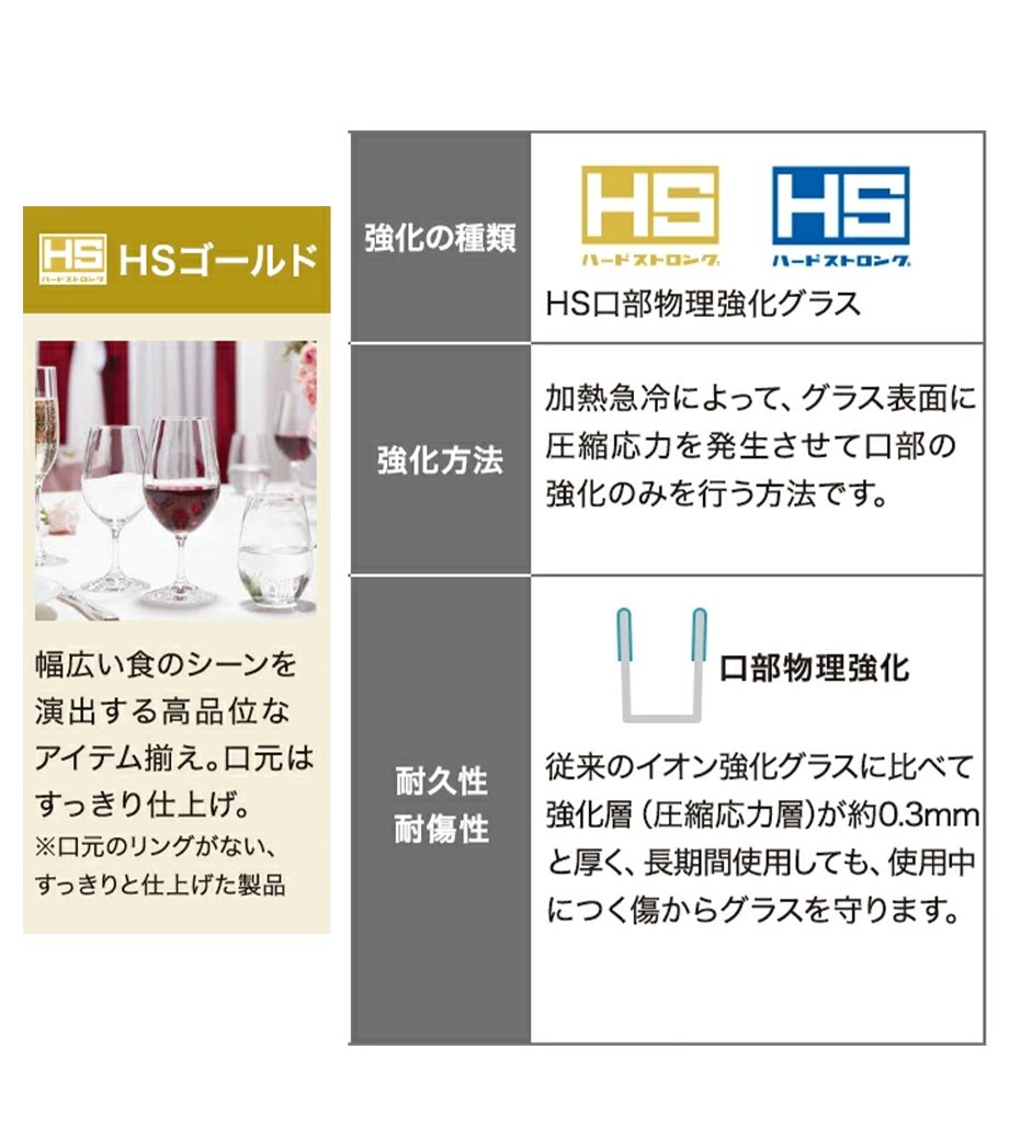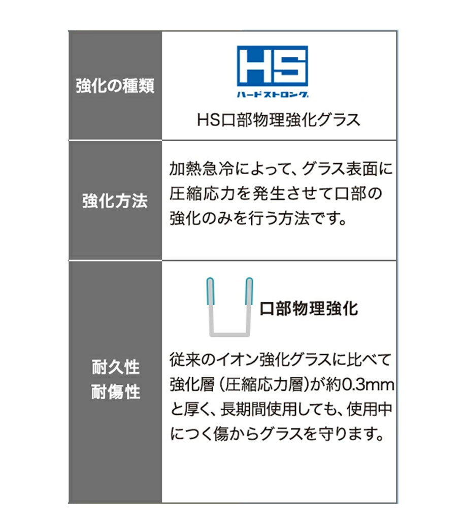 口部を厚くする加工が施されており耐久性は抜群。コールドカットですっきりとした口当たりに仕上がっています。お店のロゴを入れてオリジナルグラス制作にいかがでしょうか。
