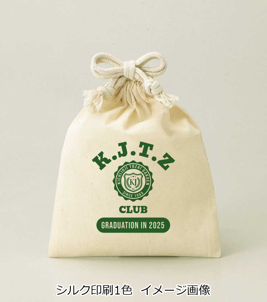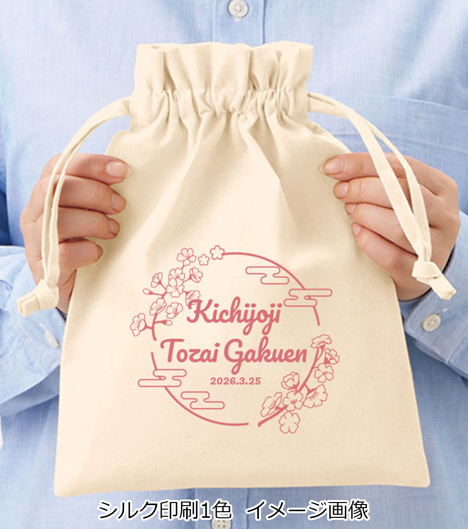巾着下部のコットン生地にシルク1色印刷かフルカラー印刷ができます。企業ロゴやイラストを印刷すればオリジナル巾着ができます!エコに関連したイベントやキャンペーンのノベルティ、ホテルの宿泊者特典にもおすすめです。