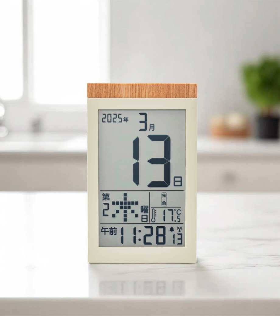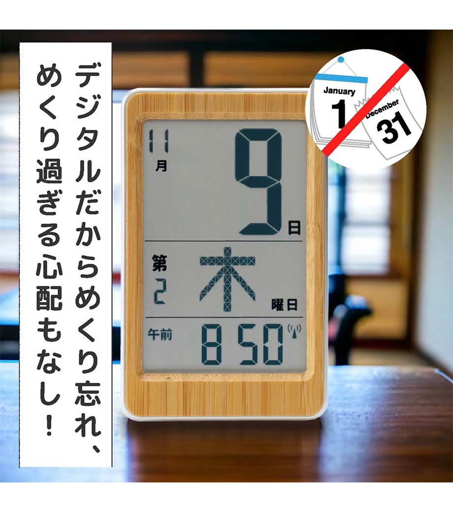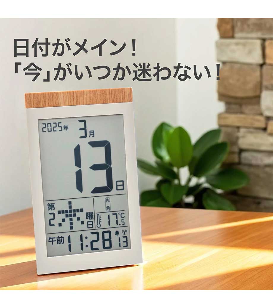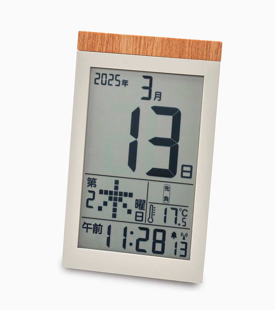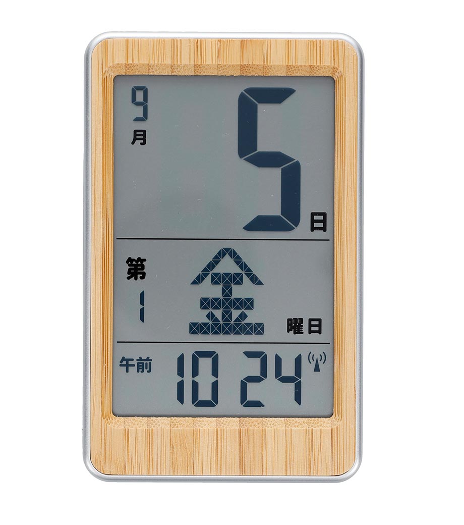 標準電波を受信し、誤差を自動修正する機能を持つ電波時計。一画面で日付と時刻はもちろん、六曜、温度、湿度、「第何曜日」が表示されます。特に「第何曜日」は、病院の休診日やごみ回収日の確認にとっても便利ですね!