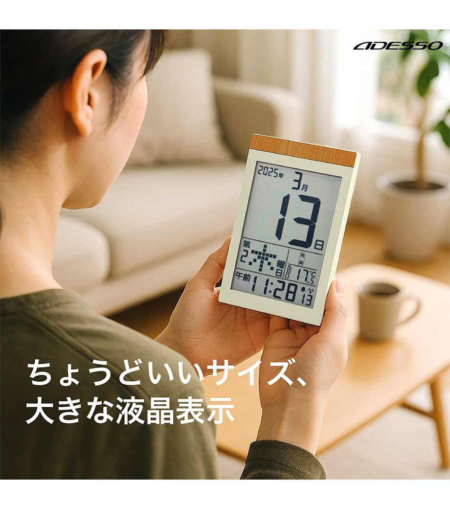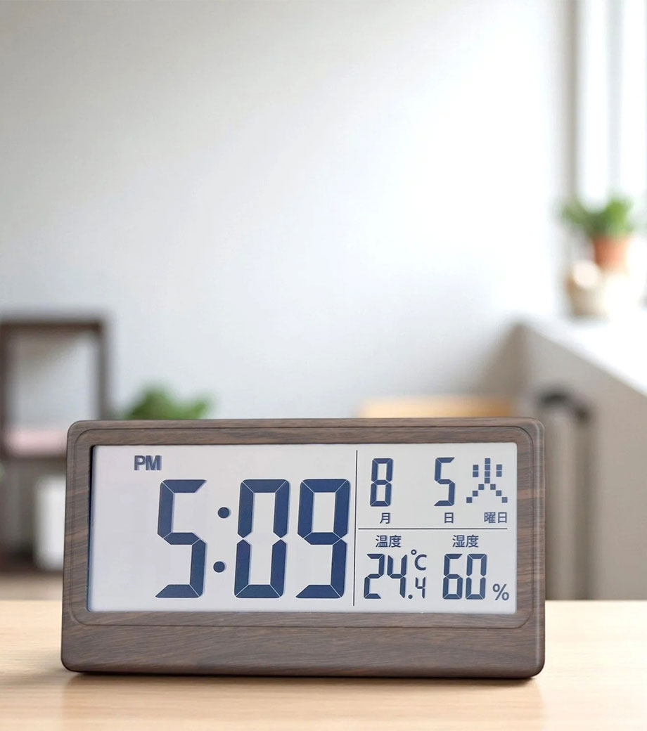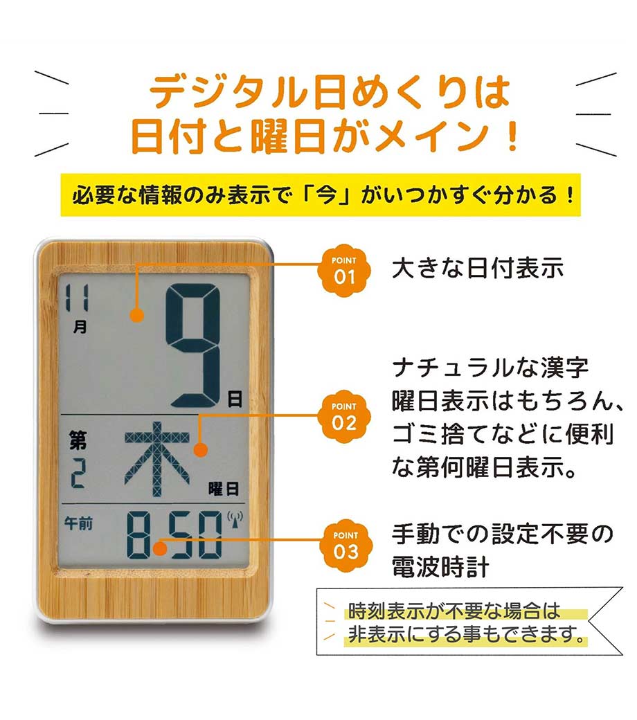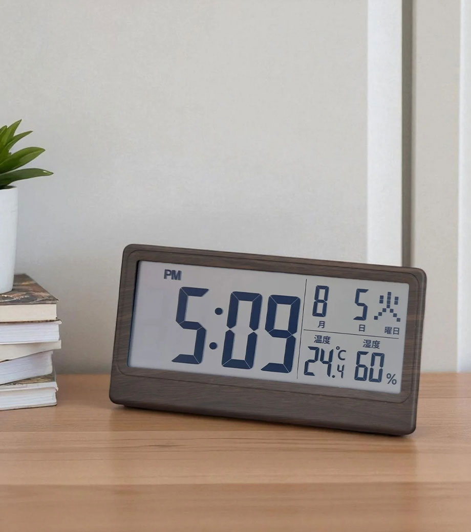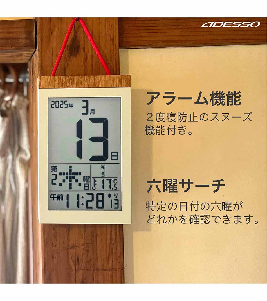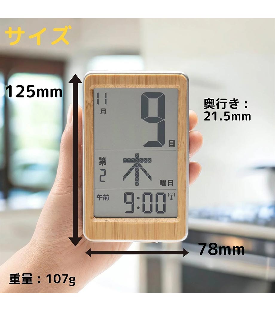 標準電波を受信し、誤差を自動修正する機能を持つ電波時計。一画面で日付と時刻はもちろん、六曜、温度、湿度、「第何曜日」が表示されます。特に「第何曜日」は、病院の休診日やごみ回収日の確認にとっても便利ですね!