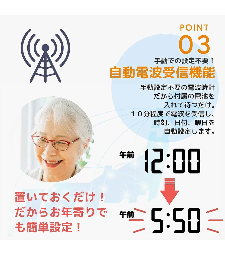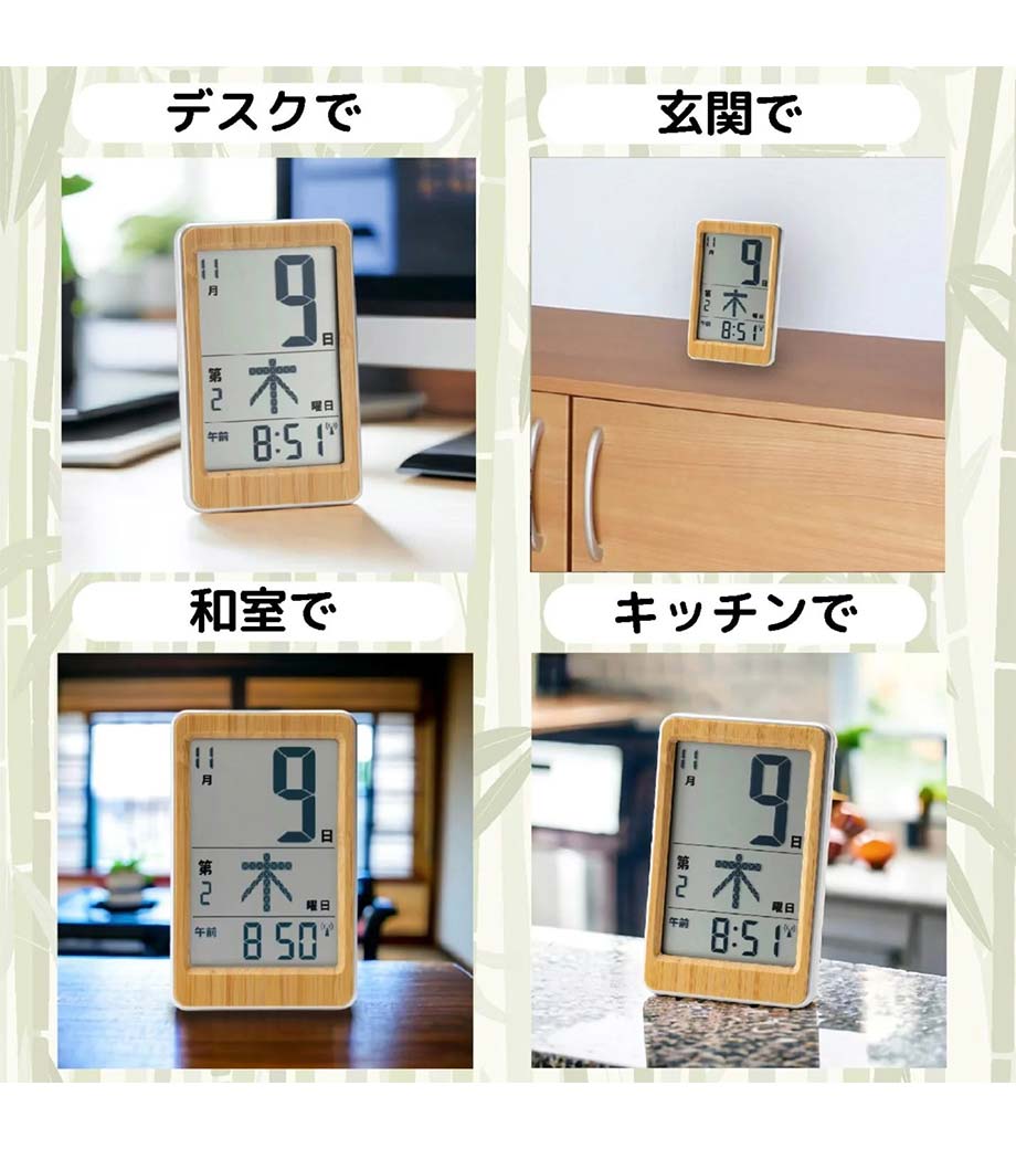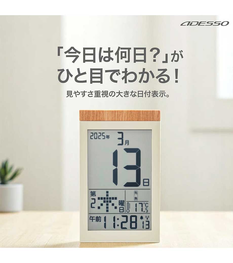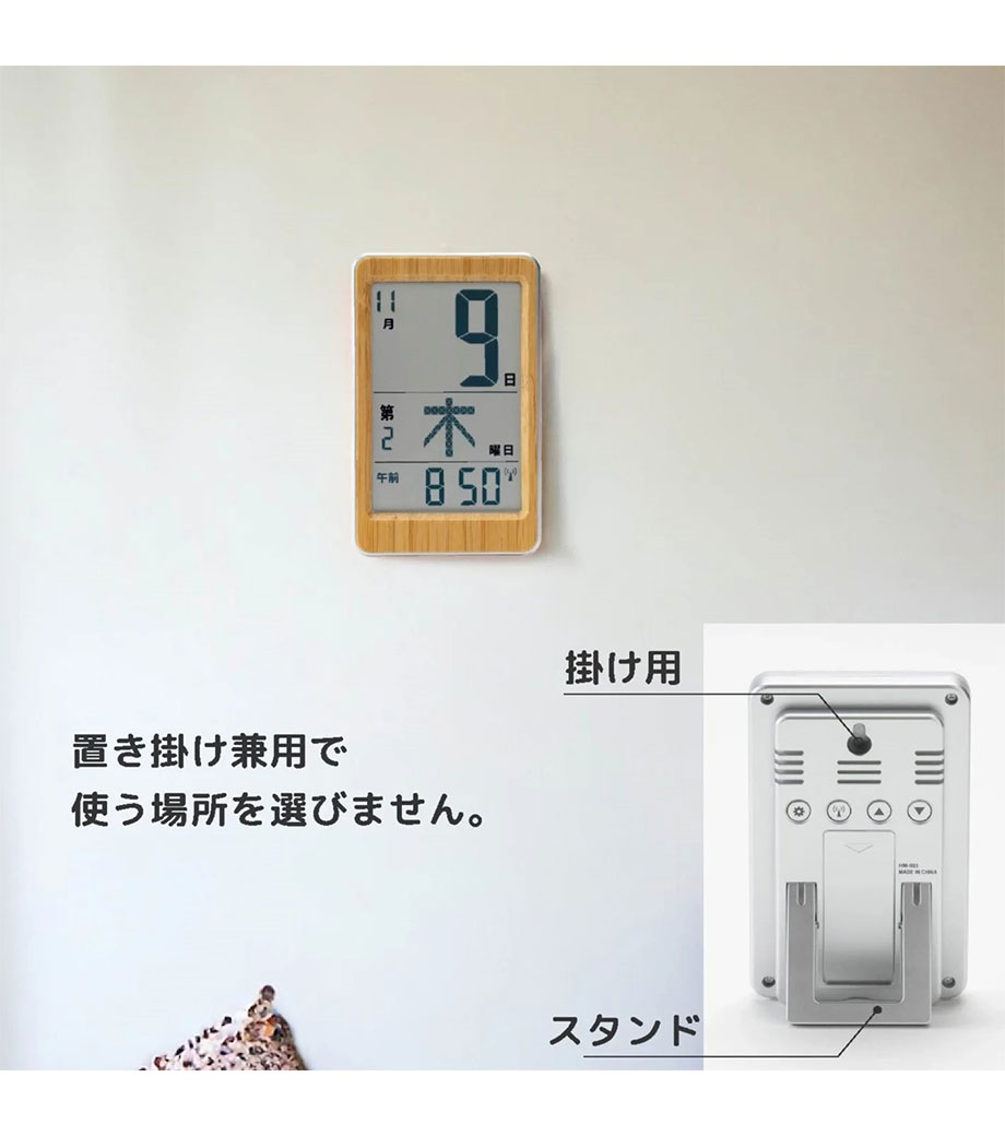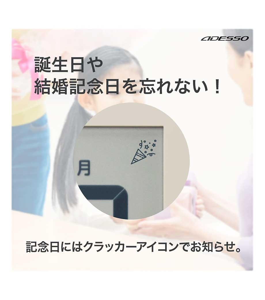 標準電波を受信し、誤差を自動修正する機能を持つ電波時計。一画面で日付と時刻はもちろん、六曜、温度、湿度、「第何曜日」が表示されます。特に「第何曜日」は、病院の休診日やごみ回収日の確認にとっても便利ですね!
