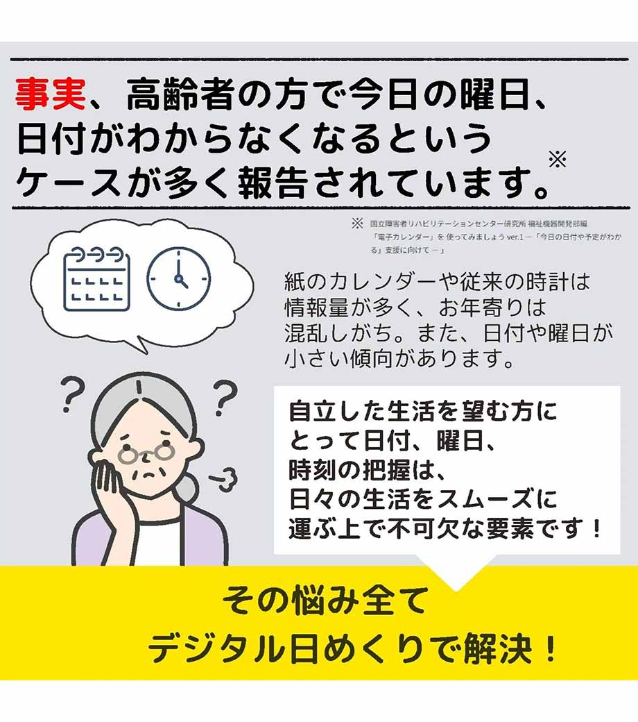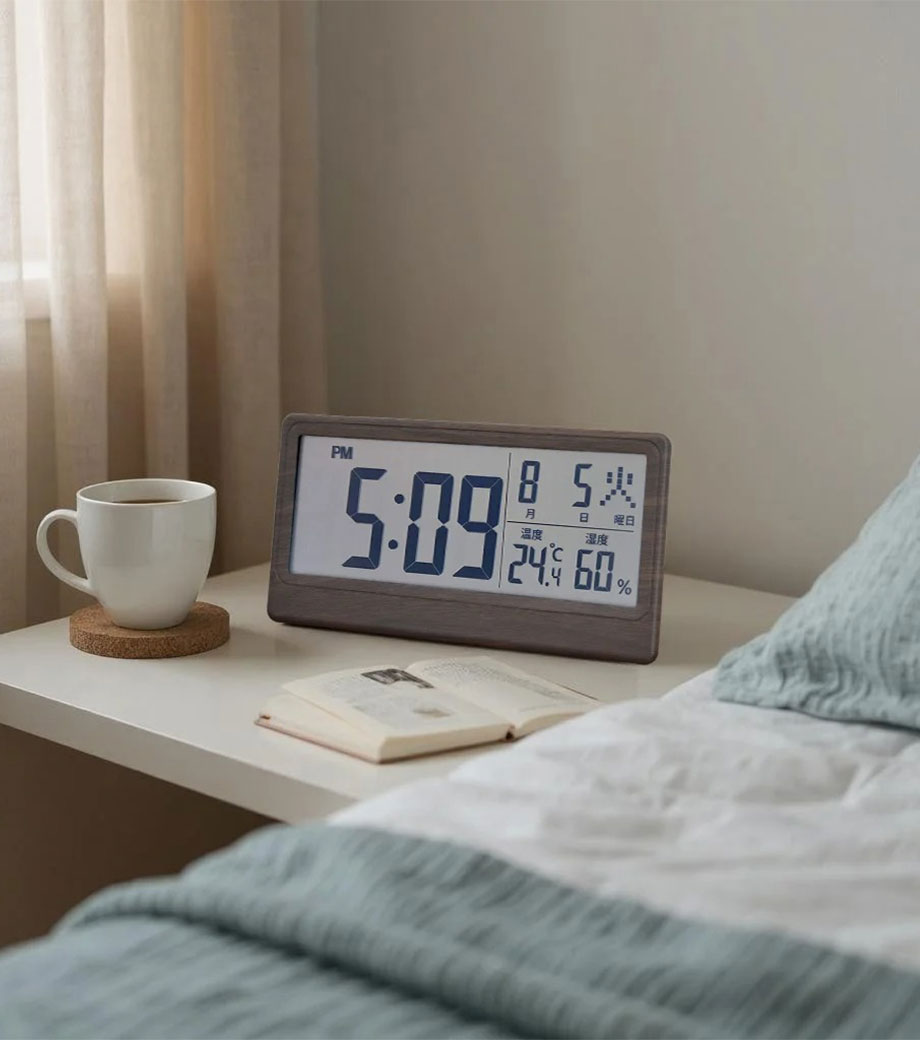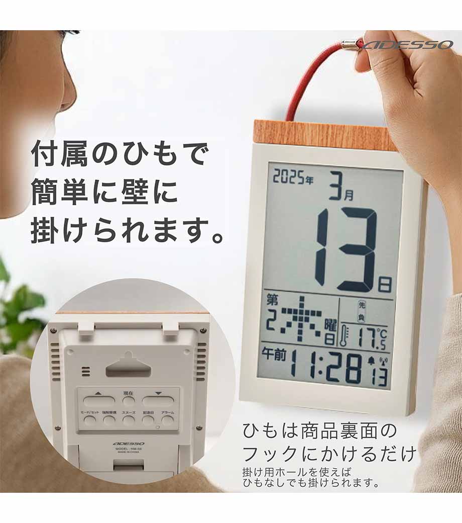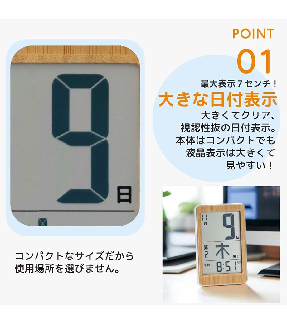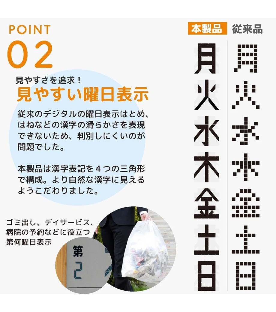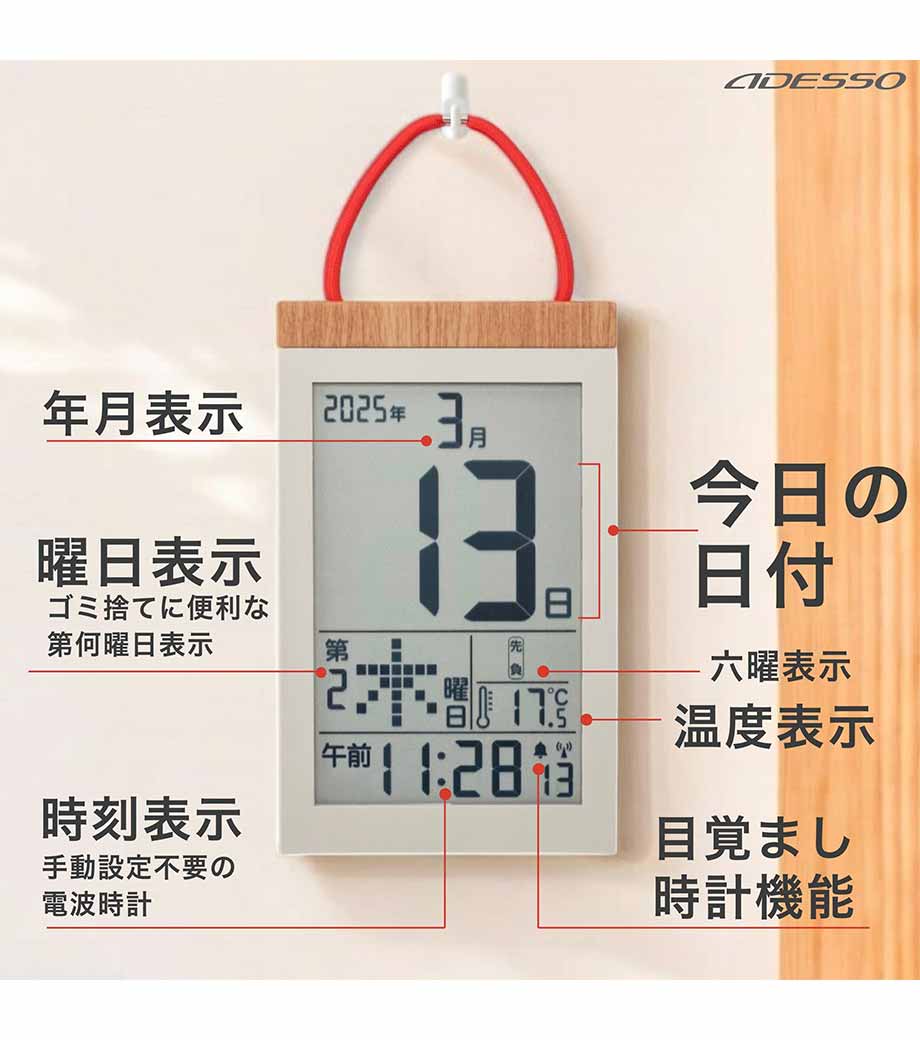 標準電波を受信し、誤差を自動修正する機能を持つ電波時計。一画面で日付と時刻はもちろん、六曜、温度、湿度、「第何曜日」が表示されます。特に「第何曜日」は、病院の休診日やごみ回収日の確認にとっても便利ですね!