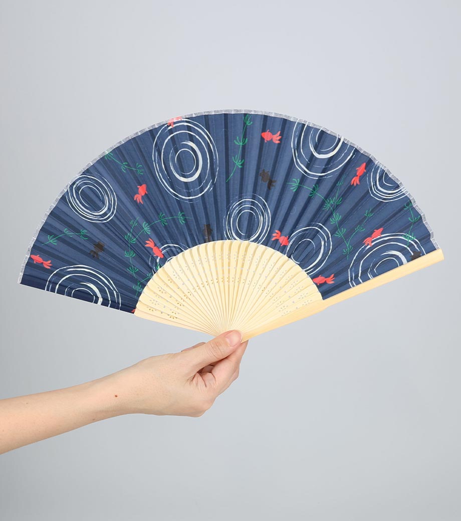 水面に泳ぐ赤と黒の金魚を描いたキュートな柄の扇子。骨組には清涼感のある白竹を使用しています。金魚は中国語でお金が有り余る「金余」の発音と同じことから、金運の象徴として中国では縁起の良い魚とされています。