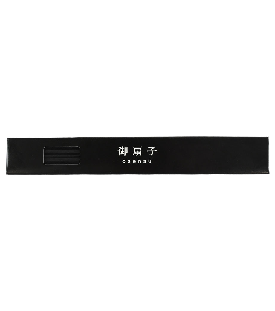 親骨にパッド印刷1色か、中骨にレーザー彫刻の名入れができます。そのまま贈答用として配れる、扇面の柄が見える窓付きの黒箱入りです。