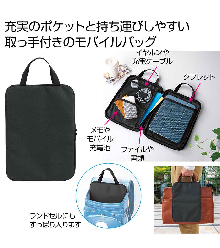 13インチまでのノートパソコンやタブレットを収納できるモバイルバッグ。内側にはタブレット用の大きなポケットのほか、メモやケーブルを整理できるメッシュポケットと、A4サイズの資料が入る大きめポケット付きです。ランドセルにも入るスリム設計で、小学生のお子さまの通学にも便利。持ち手付きで持ち運びも快適です。