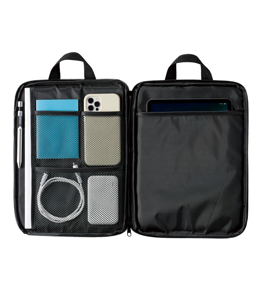 バッグ イン バッグは、タブレットPCケースとして使える収納バッグ。ポケット数が多く、通勤・通学時の鞄の中をスッキリ整理できます。バッグ内にはA4クリアファイルも収納可能です。薄型13インチ程度のタブレット端末・PCが入ります。表面にはペンやモバイルバッテリー、文庫本など小分けに収納できるポケット付き。フラットタイプなので鞄の中に入れてもかさばらず持ち運びに便利です。しっかりとハリのある素材で2mm厚のクッションが端末を保護してくれます。このバッグひとつ持ち出せばどこでも作業がはかどりますね。
