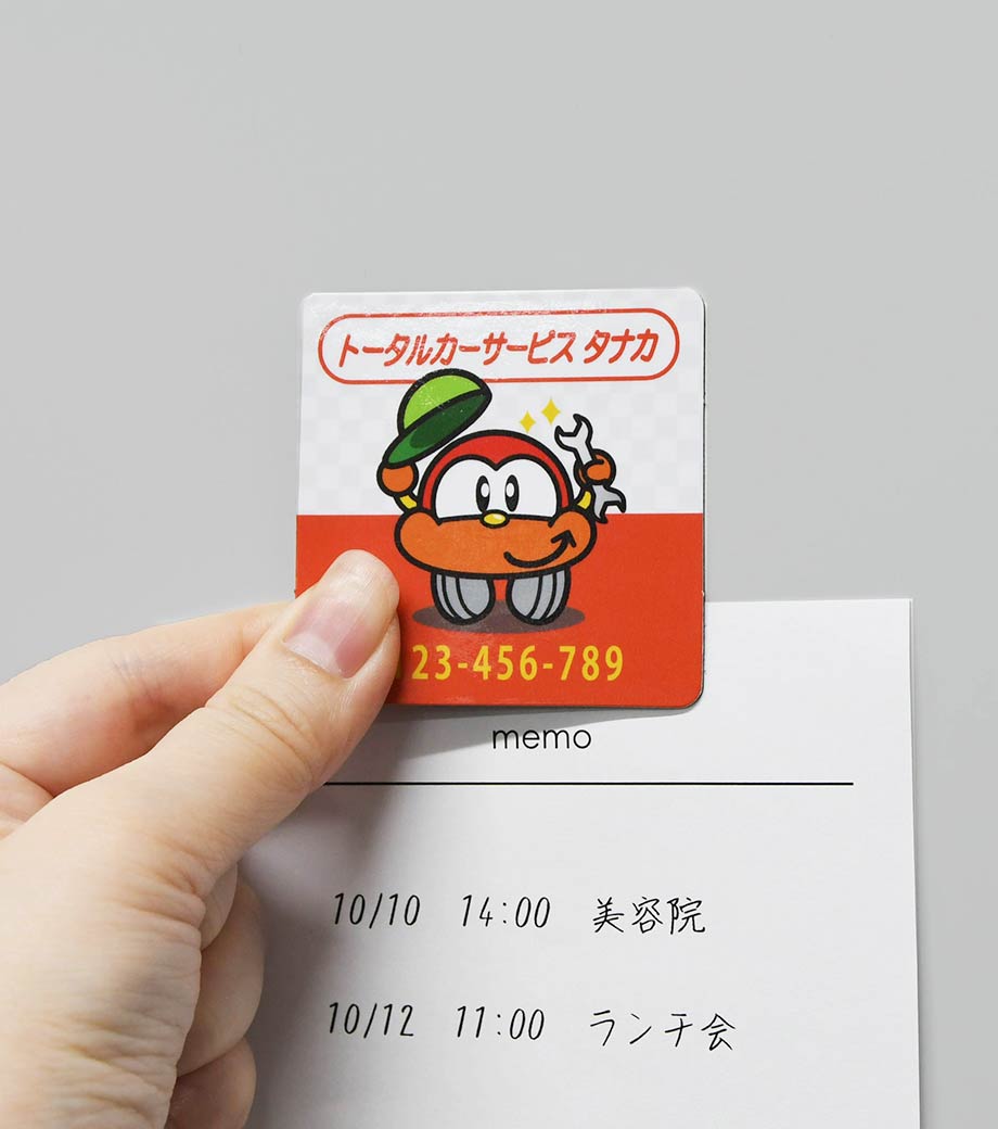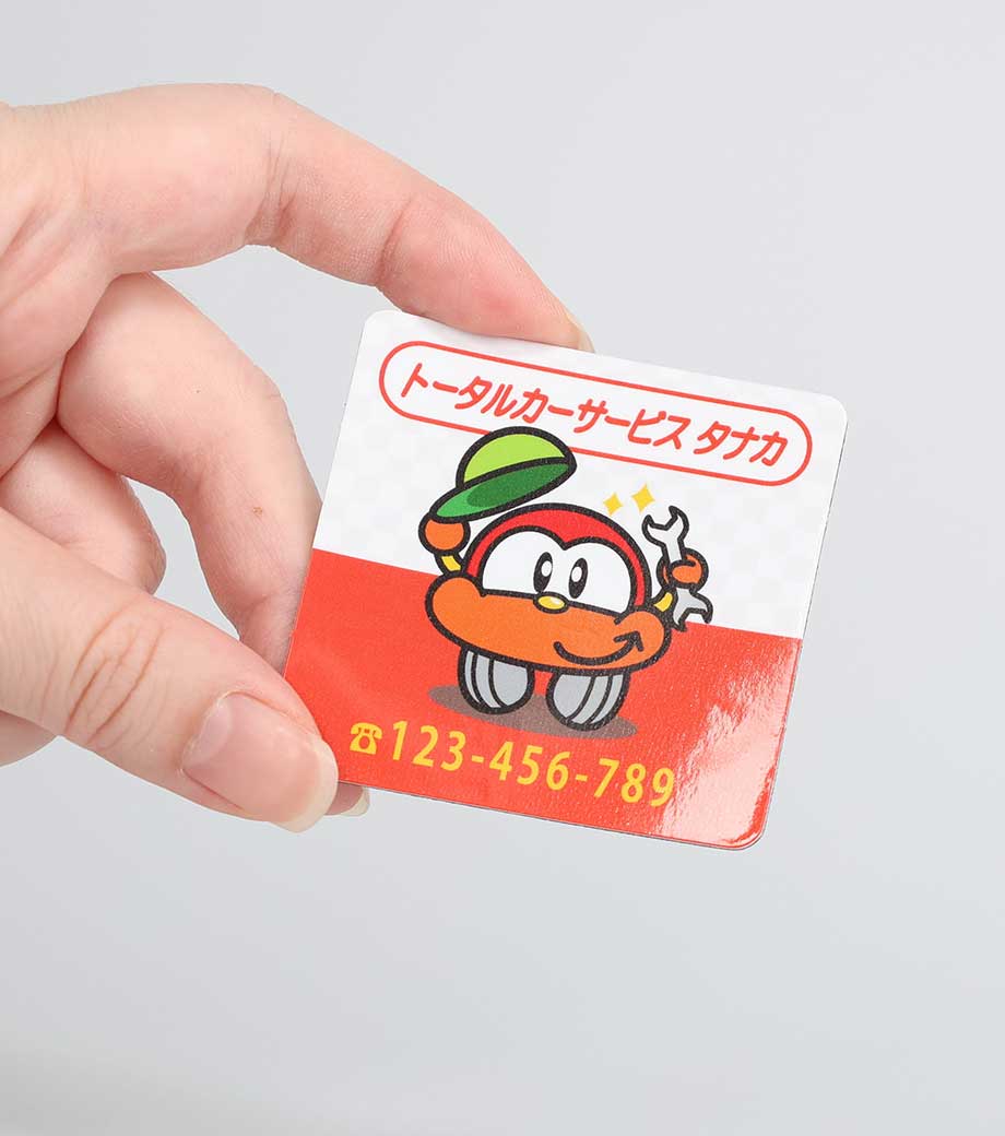 イラストや写真もフルカラーで印刷できる、シート状のマグネットです。冷蔵庫や金属製の扉に貼れて日常的に目につきやすく、宣伝効果が高いのが特長。サイズは55×55mmとコンパクトなので、営業訪問時に粗品として手渡したり、資料と一緒にポストインするのにおすすめです。